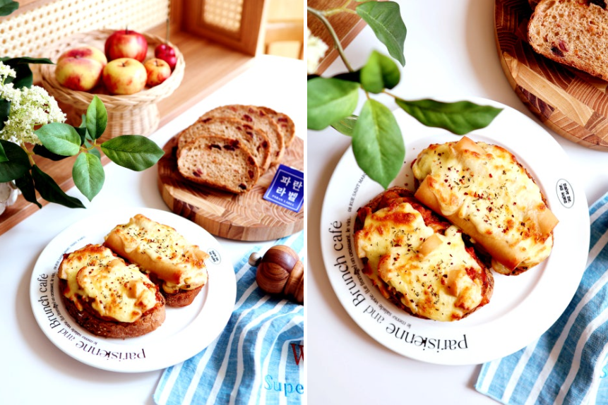 이어 블로거 ‘원더어멈’님은 파란라벨 쫄깃담백 루스틱에 의외의 조합을 얹었는데요. 바로 토마토 콩피와 볶은 김치, 치즈를 더한 김치치즈빵! 예상 밖의 만남이었지만, 쫄깃한 건강빵과 새콤고소한 토핑이 어우러져 놀랍도록 잘 어울렸죠.