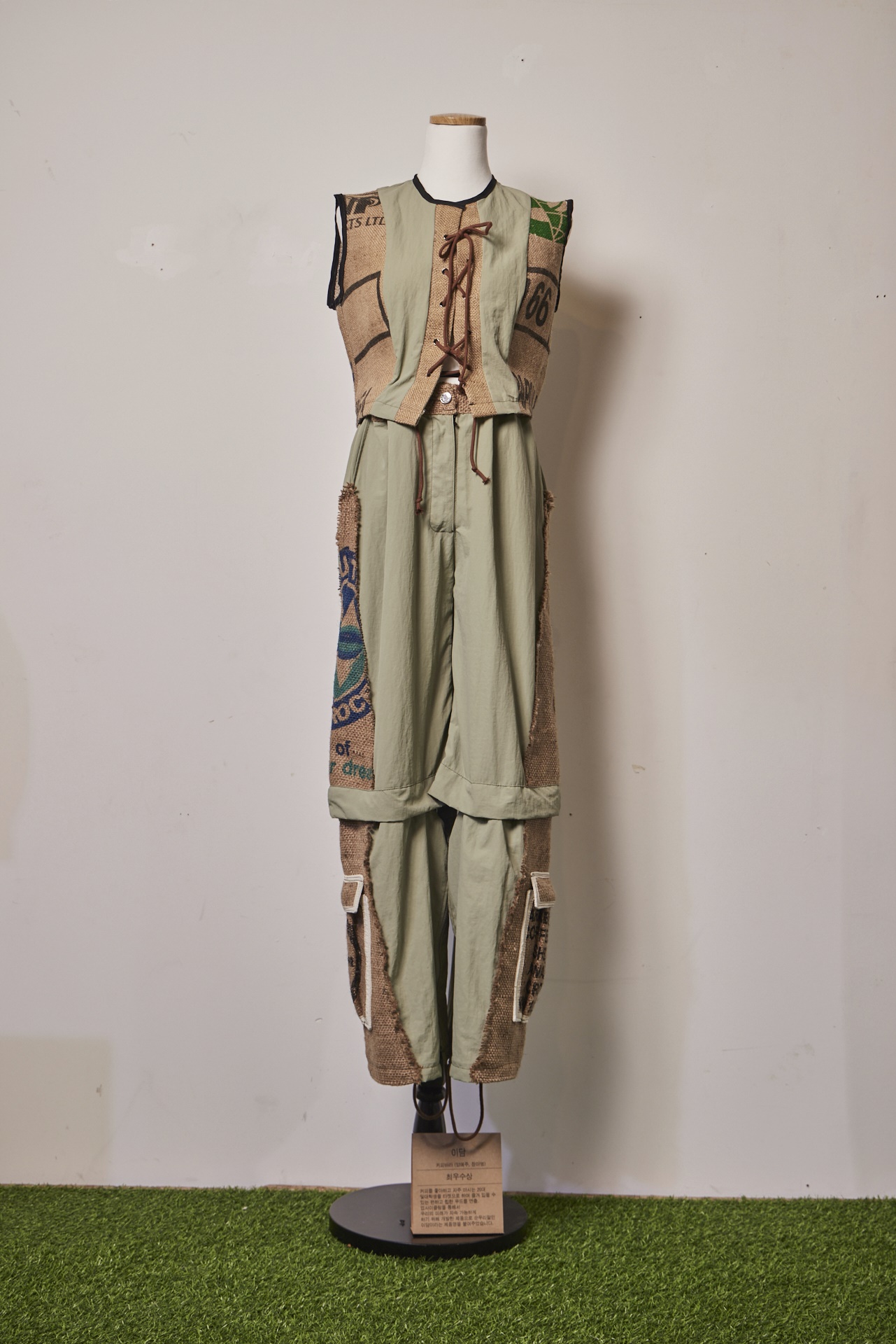 이 작품은 학생들이 일상에서 편하게 입을 수 있는 카고팬츠를 제작해 더울 때는 무릎 아래를 분리해 시원한 버뮤다팬츠로 입을 수 있도록 하고, 분리되는 부분에 지퍼와 스트링을 더해 디자인 요소를 가미하는 동시에 가볍게 멜 수 있는 스트링백으로 변신하도록 디자인했습니다.
