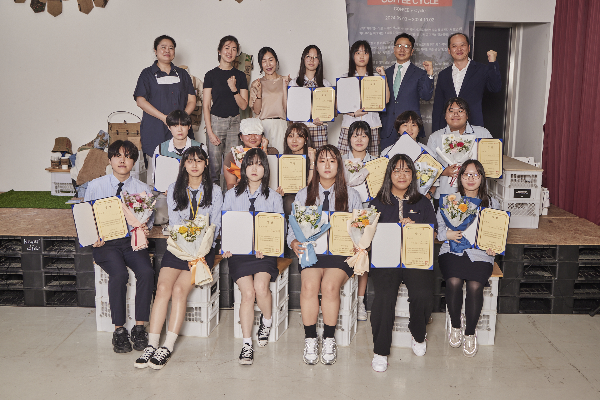 제2회 ‘커피자루 업사이클 디자인 공모전’의 우수상, 장려상 수상 학생들