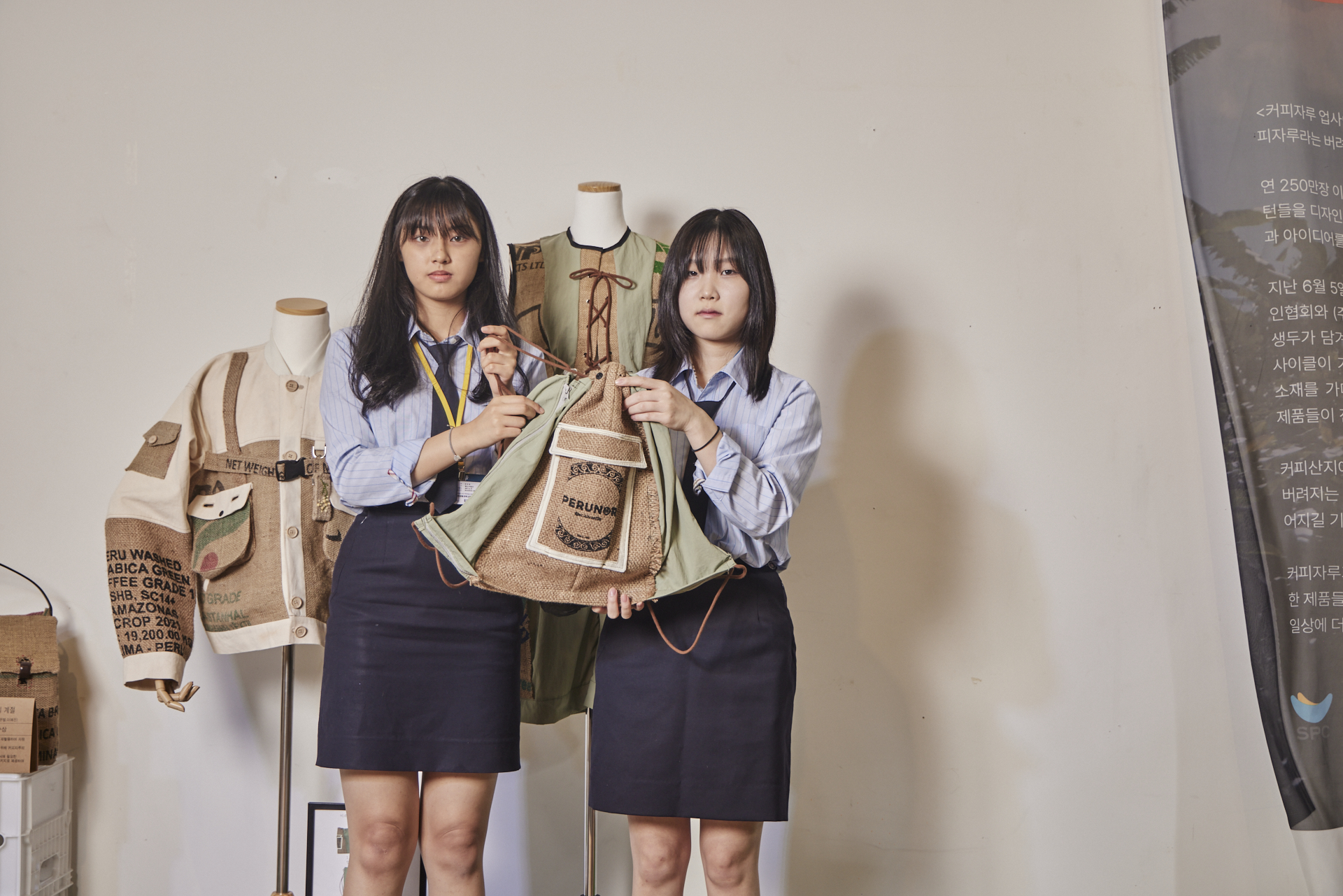 최우수상은 커피자루와 의류 자투리원단을 활용해 한 벌로 4계절 내내 활용할 수 있도록 다양하게 변신이 가능한 바지와 상의를 디자인한 인천생활과학고 양예주, 장아영 학생이 영예를 안았습니다.