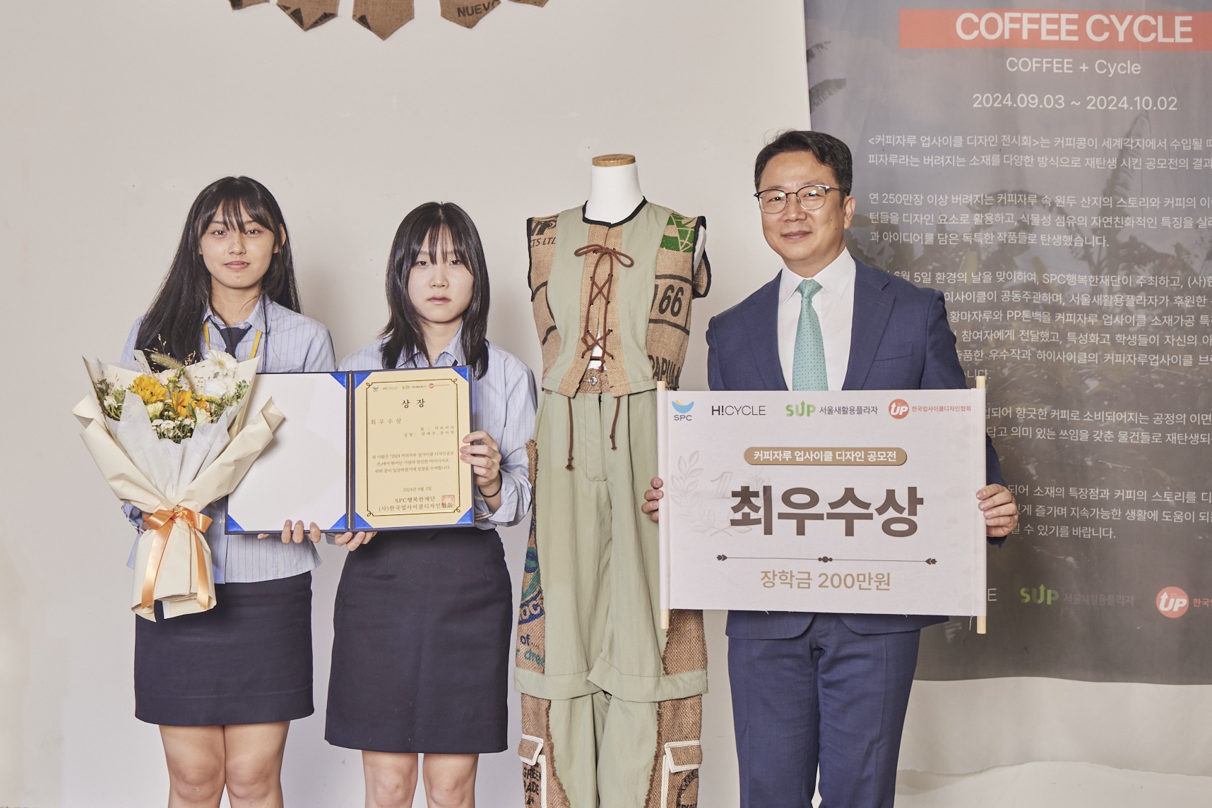 SPC행복한재단 백승훈 사무국장(오른쪽)과 최우수상을 수상한 인천생활과학고등학교 양예주(가운데), 장아영(왼쪽) 학생