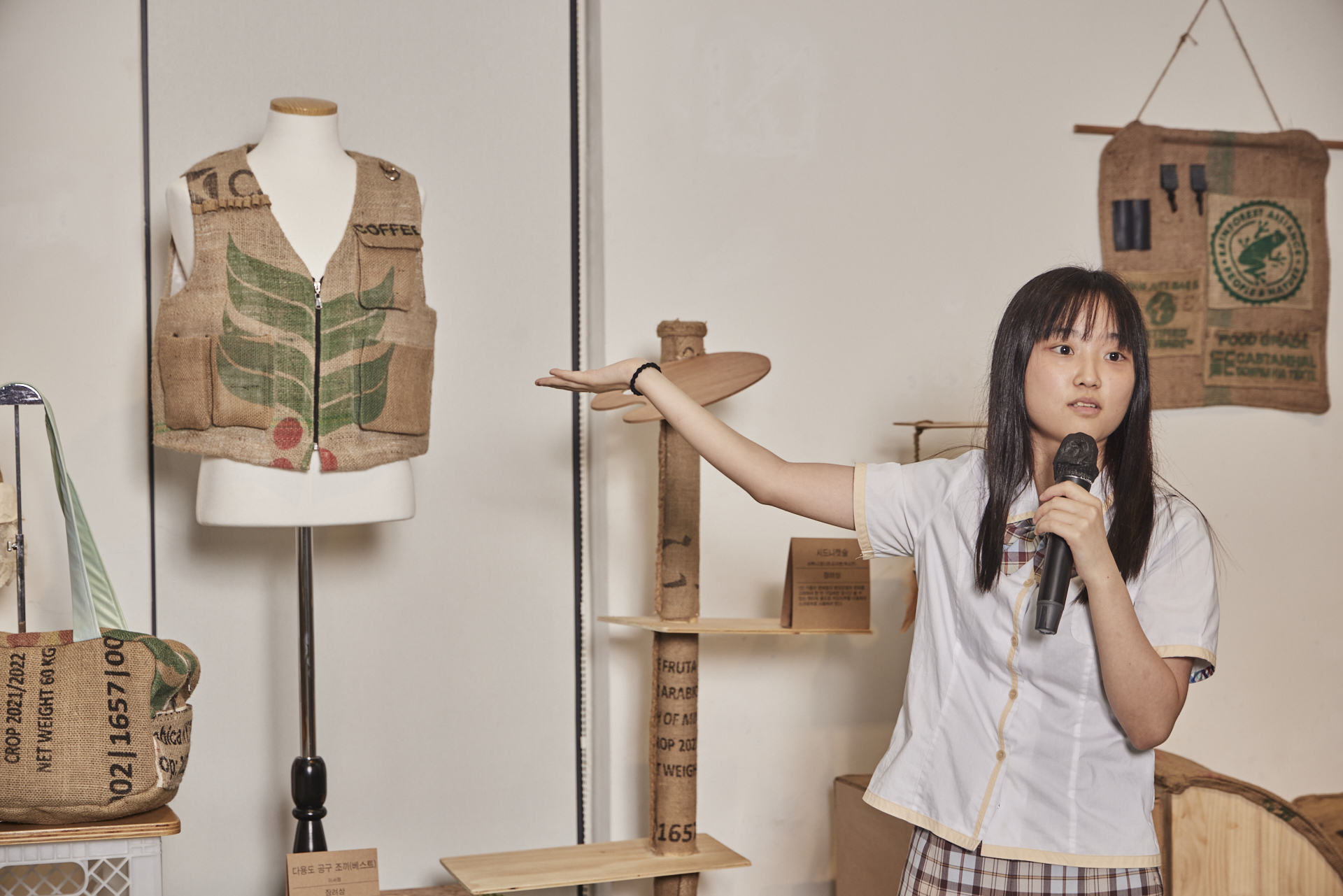 제2회 ‘커피자루 업사이클링 디자인 공모전’은 시상식에 그치지 않고 9월 3일부터 10월 2일까지 한 달간 서울새활용플라자 내 ‘새활용하우스’에 수상작이 전시되었습니다. 이 전시에서는 미래를 이끌어갈 학생들의 뜨거운 열정과 무한한 아이디어 및 업사이클링의 창의적인 면모를 확인할 수 있었는데요. 커피자루가 가치 있는 자원으로서 순환되고, 커피 문화를 더욱 의미 있게 즐길 수 있는 방안임을 확인할 수 있었습니다.