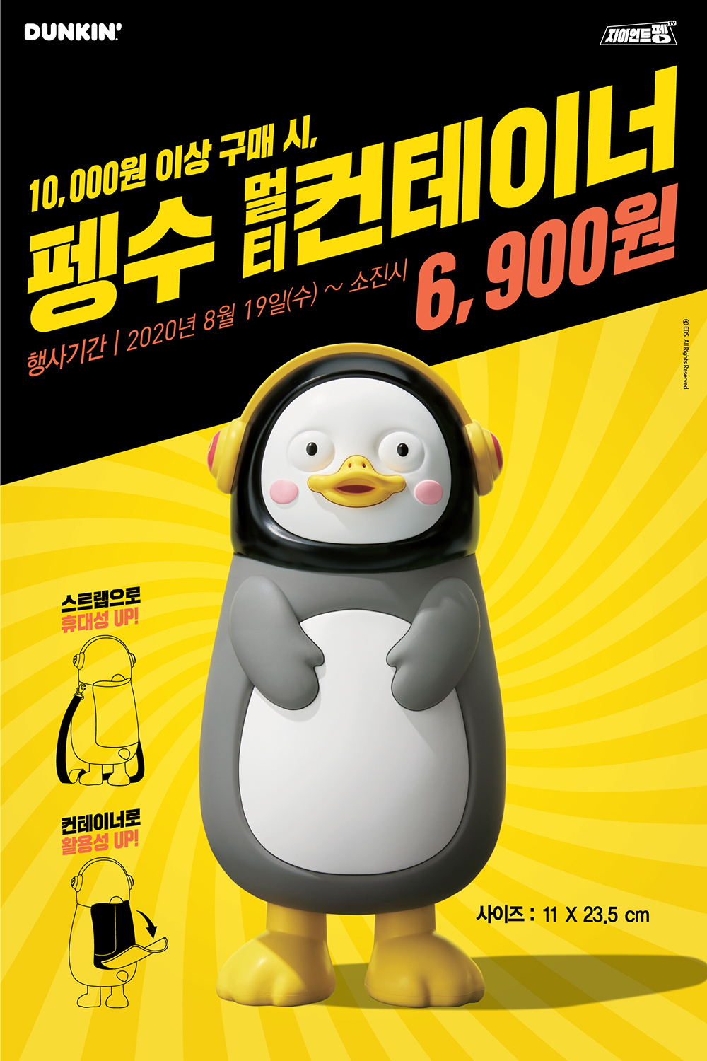 던킨의 ‘펭수 멀티 컨테이너’는 EBS의 인기 크리에이터 펭수를 그대로 재현한 다용도 수납함이다. 헤드셋을 끼고 위풍당당하게 서 있는 펭수의 깜찍한 모습이 돋보이는 제품으로, 뒷면을 열어 다양한 소품 등을 넣을 수 있는 구조다. 높이 약 23cm의 넉넉한 사이즈를 자랑하며, 스트랩을 함께 제공해 휴대성도 높였다. (프로모션 상품 소진 시 행사 자동 종료, 일부 매장 제외, 자세한 사항 홈페이지 참조)