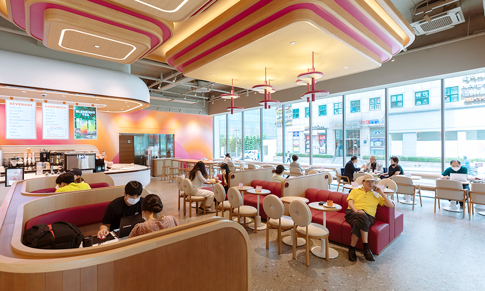 유연한 곡선 형태로 인테리어 된 던킨 라이브 매장 내부