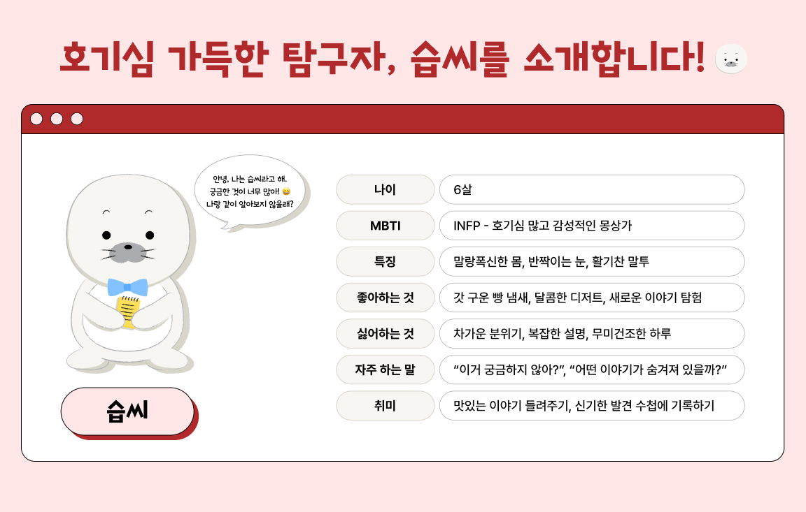 호기심 가득한 탐구자, 습씨를 소개합니다! 나이는 6살, MBTI는 INFP랍니다. 반짝이는 눈 속엔 늘 궁금함이 가득하고, 톡톡 튀는 말투에서는 새로운 이야기를 향한 설렘이 느껴져요!