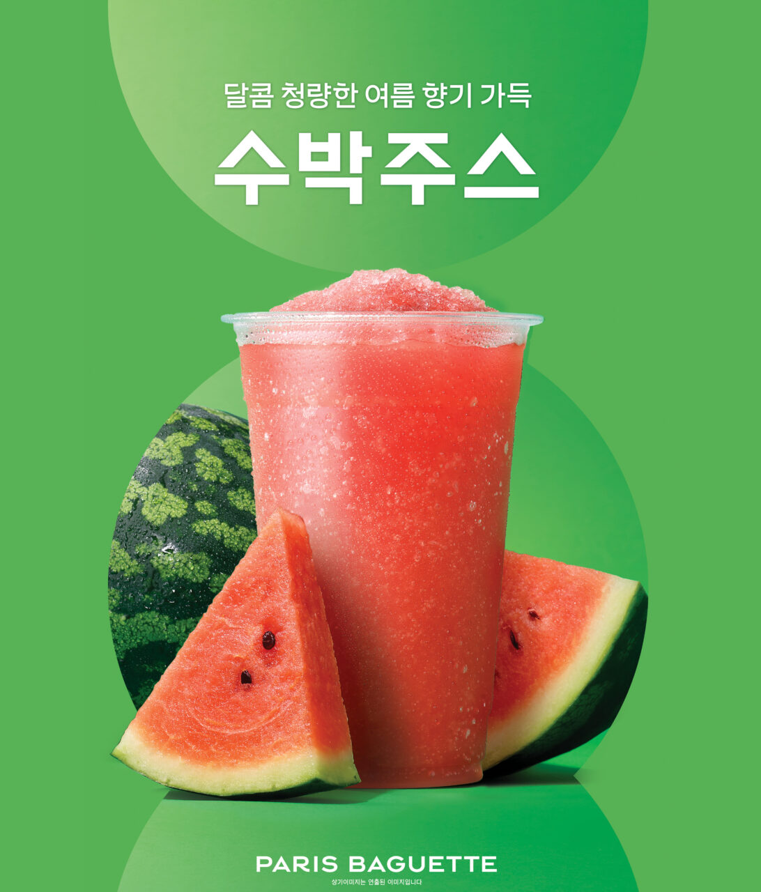 수박 고유의 달콤한 맛과 청량감을 가득 느낄 수 있는 파바표 수박주스! 더운 날씨에 시원하게 즐기기 좋아요.