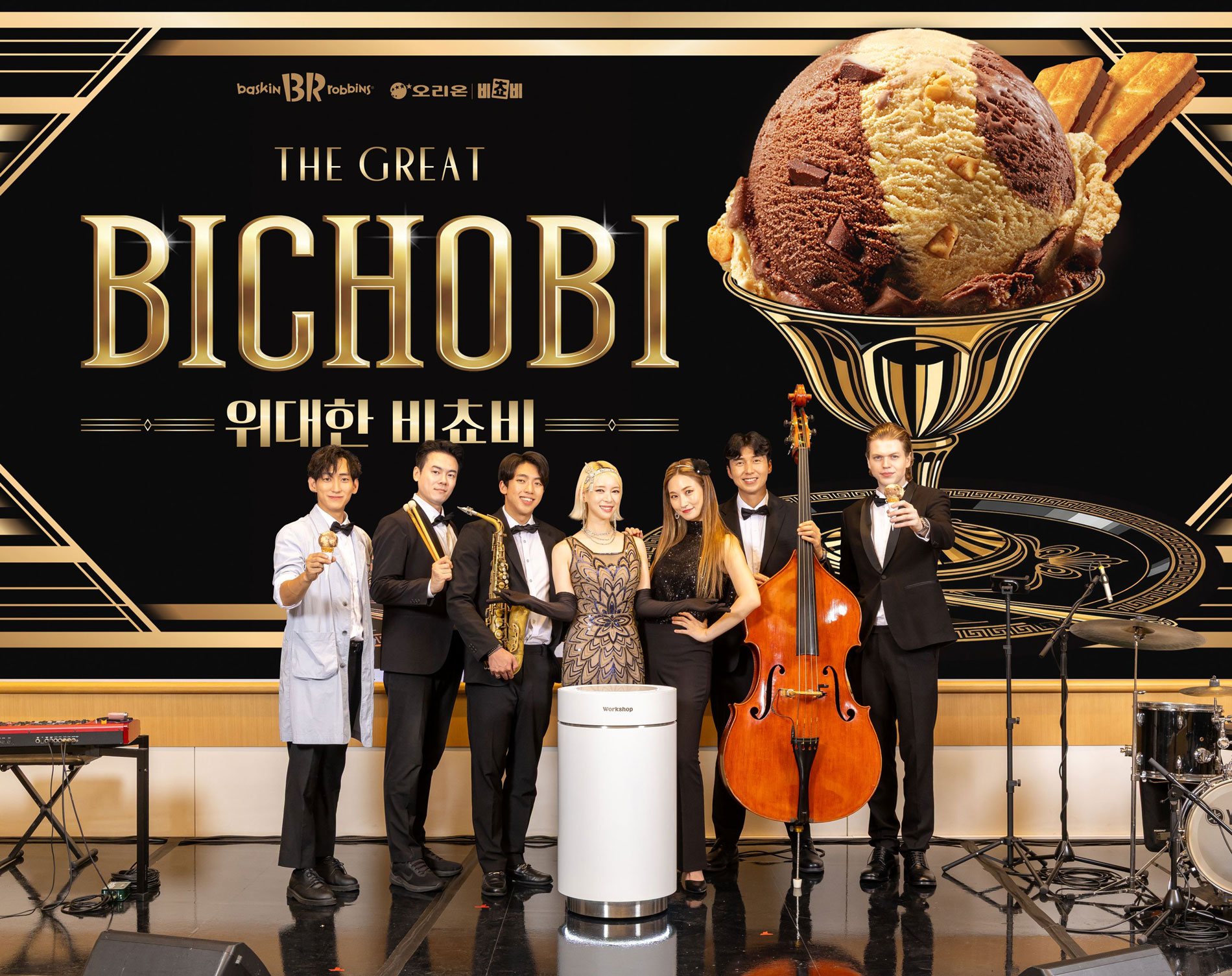27일 ‘워크샵 by 배스킨라빈스’에서 열린 9월 이달의 맛 ‘위대한 비쵸비’ 언텁쇼에서 브랜드 스토리텔러 닥터(왼쪽), 재즈밴드 리치파이(RICHPY·중앙), 모델(오른쪽)이 신제품을 소개하고 있다.