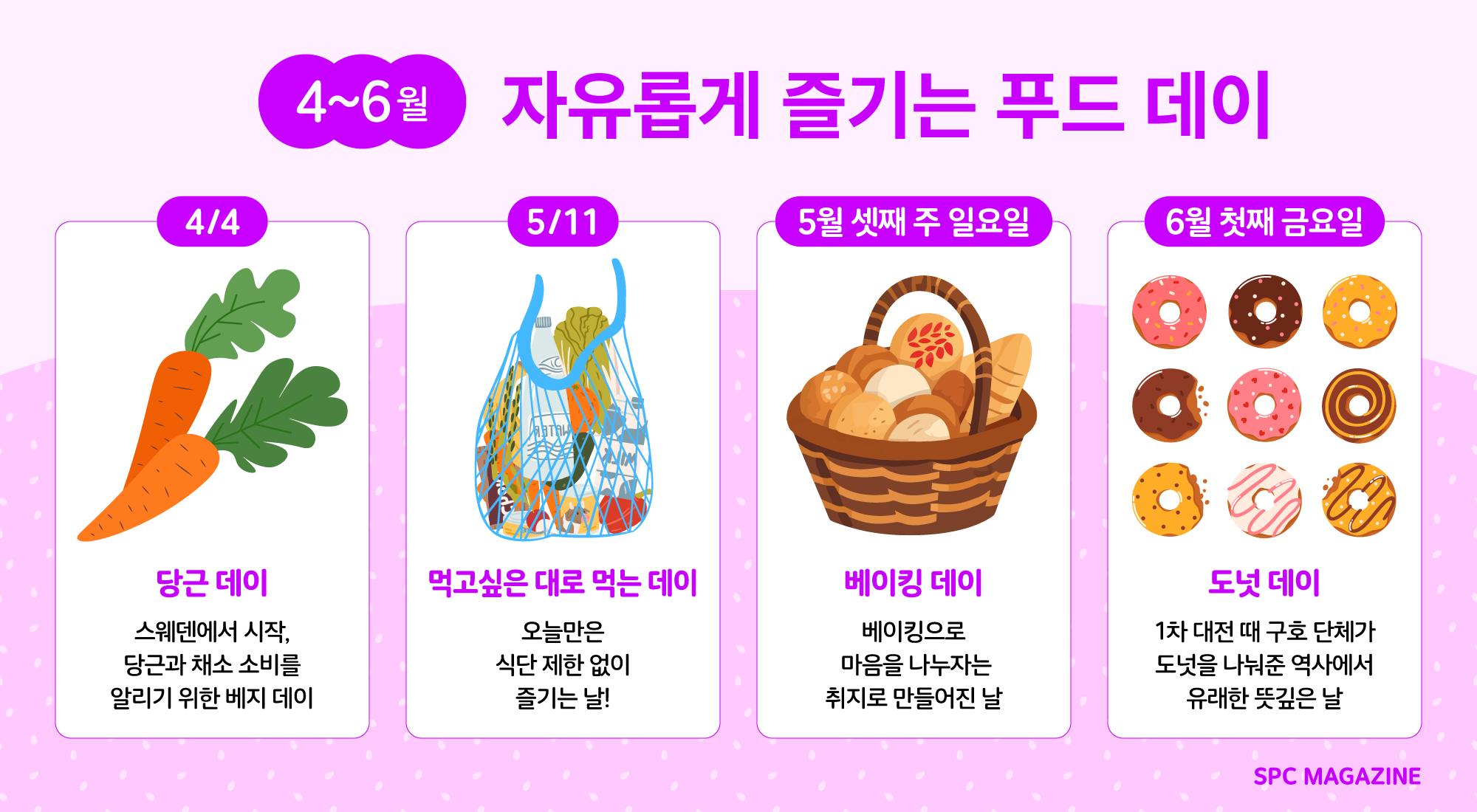 이번 푸드 데이 캘린더는 세계 곳곳에서 즐겨 사용하는 테마 데이를 바탕으로, SPC 브랜드들과 함께 즐길 수 있는 메뉴들을 소개했습니다. 문화권에 따라 기념 방식은 조금씩 다르지만, 음식을 재밌게 즐기고 싶은 순간이라면 SPC매거진이 전하는 푸드 캘린더를 꺼내보세요! 😊✨