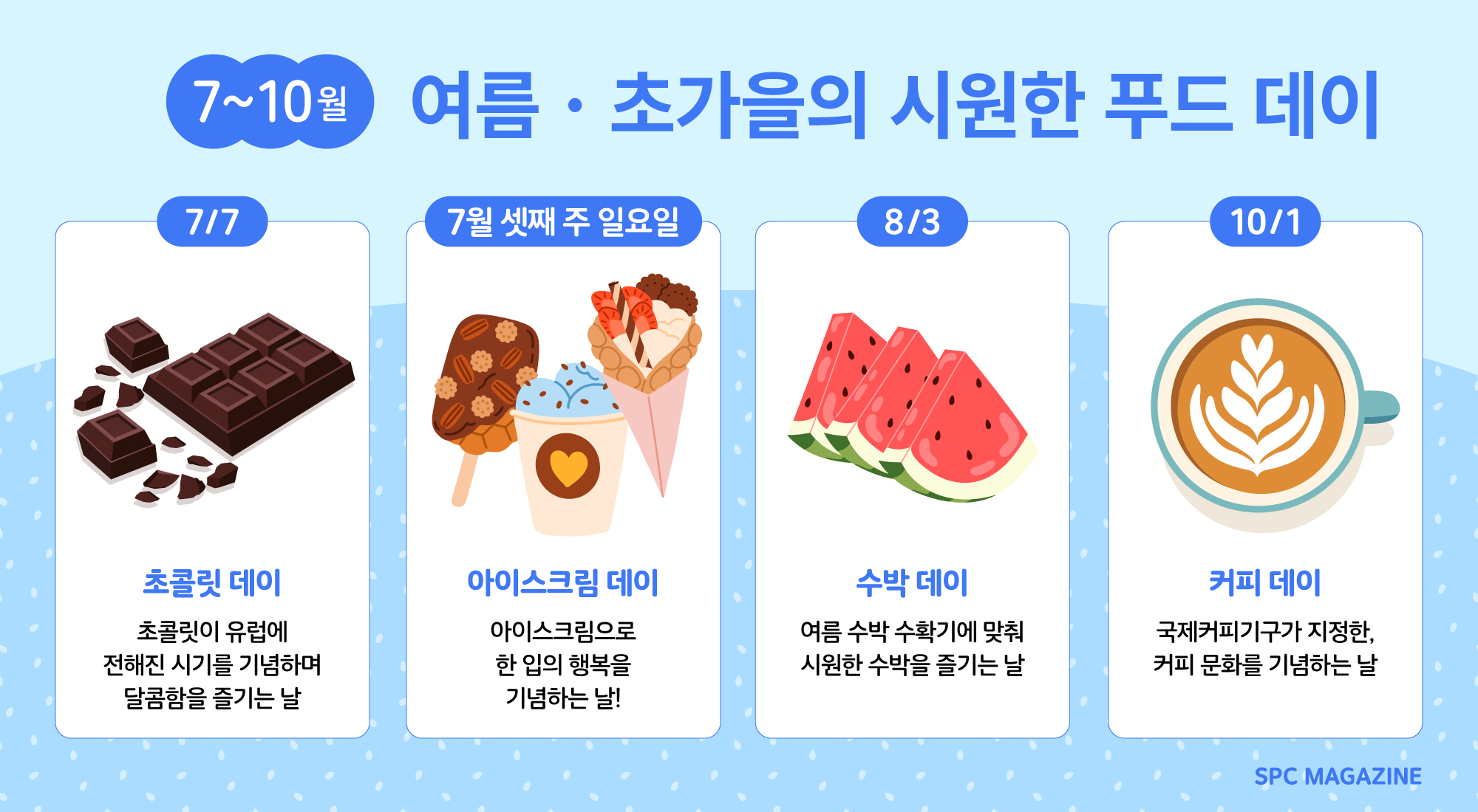 여름에서 초가을로 넘어가는 7월부터 9월은 계절적 특색이 강한 푸드 데이들이 집중되어 있습니다. 무더위를 잊게 해주는 시원함과 달콤함을 SPC그룹 브랜드와 함께 즐겨보세요. ⛱️