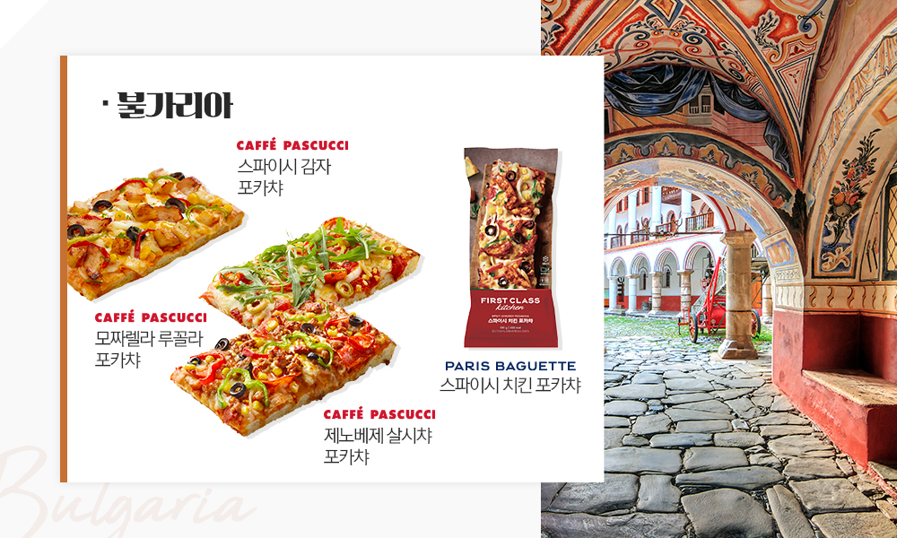 이탈리아 전통 커피 전문점인 파스쿠찌에서도 포카챠 메뉴를 만날 수 있습니다. 이탈리아 생햄 ‘살시챠’와 페퍼로니아 어우러져 중독성 있는 맛을 내는 ‘제노베제 살시챠 포카챠’와 감자와 치킨을 올려 한국인의 입맛에 딱 맞는 매콤함이 매력인 ‘스파이시 감자 포카챠’, 그리고 토마토와 신선한 루꼴라가 풍성하게 올라간 ‘모짜렐라 루꼴라 포카챠’를 추천합니다. 또한 파리바게뜨의 HMR 전문 브랜드인 ‘퍼스트 키친 클래스’에서도 에어프라이어를 통해 집에서도 간편하게 먹을 수 있는 포카챠 제품이 준비되어 있는데요. 이탈리아산 프리미엄 밀가루와 천일염, 엑스트라 버진 올리브 오일 등 엄선된 원료를 사용한 ‘스파이시 치킨 포카챠’는 어떠신가요? 담백한 포카챠 빵 위에 갖가지 토핑이 조화되어 온 가족이 맛있게 먹을 수 있는 포카챠 제품을 통해 불가리아의 문화를 집에서 느껴보세요!