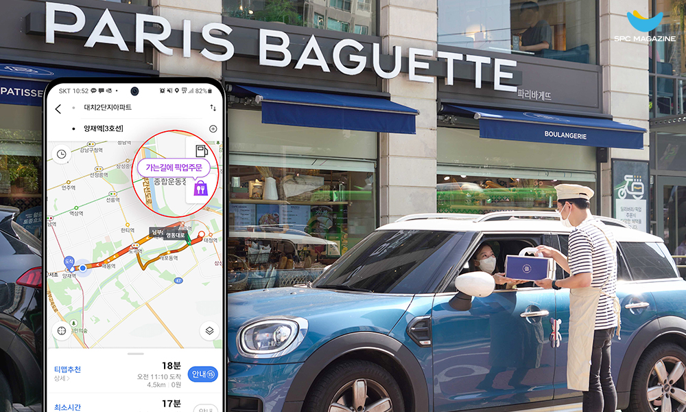 지난해 10월에는 국내 최대 규모의 내비게이션 앱을 운영하는 티맵 모빌리티와 손잡고 ‘티맵(TMAP) 픽업 주문’ 서비스를 론칭했는데요. 고객은 해당 서비스를 통해 SPC그룹 브랜드 제품 픽업 주문과 길 안내 서비스를 한 번에 제공받을 수 있습니다. 티맵 경로 검색 페이지에서 주문 버튼을 누르면 고객의 이동 경로 내 SPC그룹 브랜드 매장 검색이 가능합니다. 원하는 매장과 제품을 선택하고 결제를 완료하면 해당 매장이 경유지에 자동으로 추가되는데요. 목적지까지 가는 길에 간편하게 제품을 픽업할 수 있습니다.
