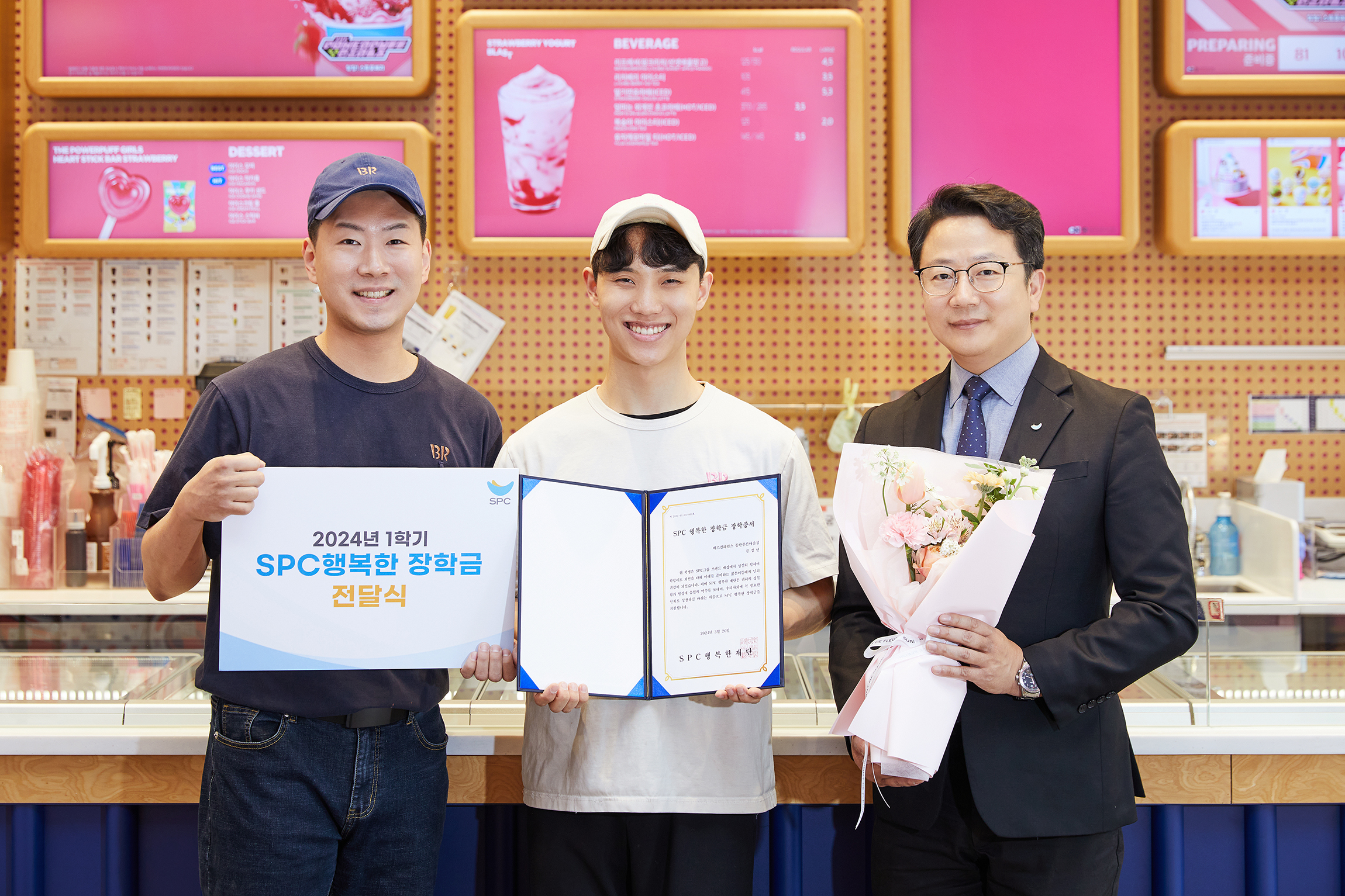 2024년 1학기 SPC행복한장학금 장학생으로 선발된 배스킨라빈스 동탄푸른마을점 김경민 학생(가운데)