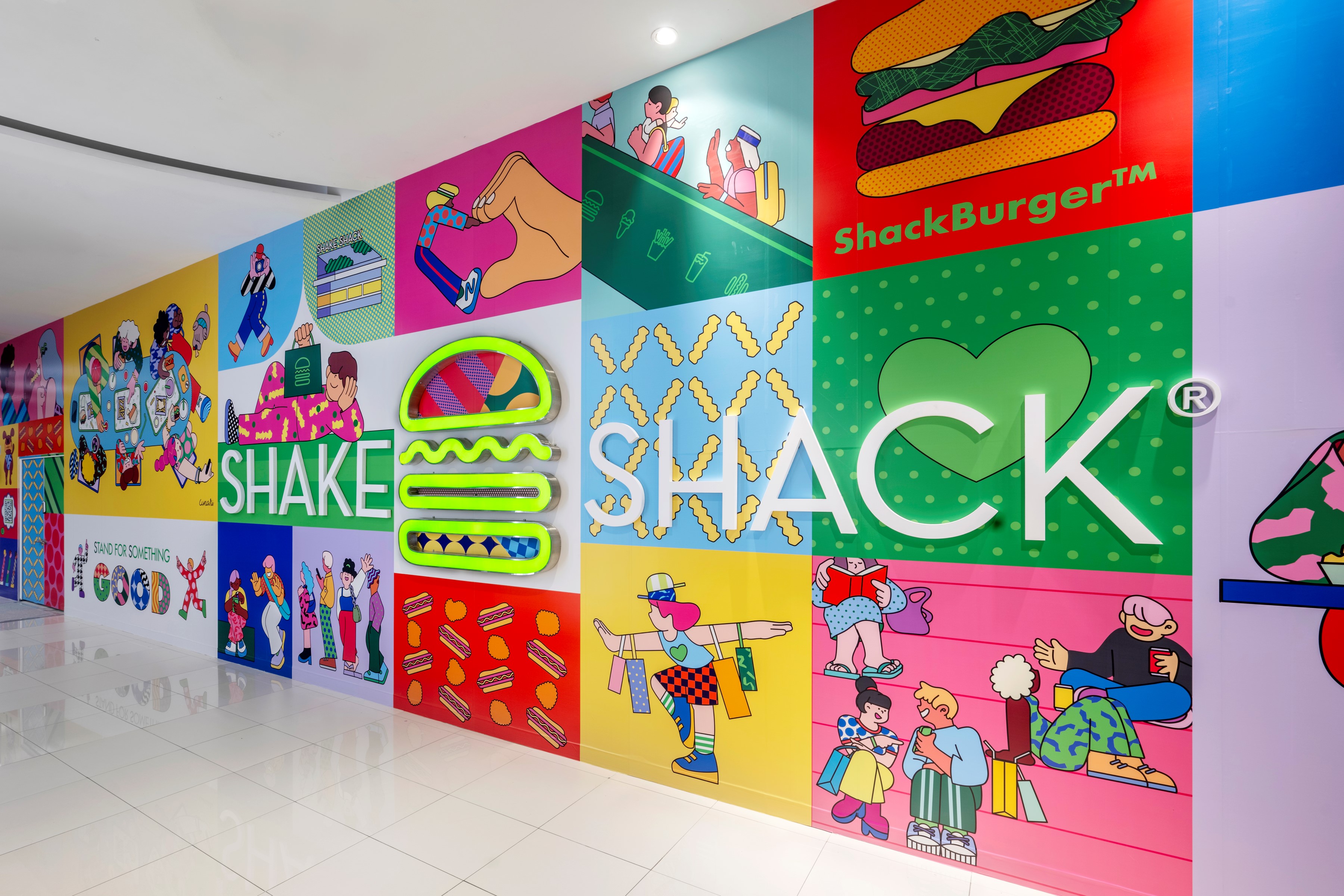 이번 호딩아트는 일러스트레이터 ‘우나리’와 함께 ‘색색 쉑쉑 (Colorful Shack)’ 이라는 주제로 다양한 국적의 사람들이 밝고 활기찬 분위기 속에 쉐이크쉑과 어우러지는 모습을 그렸다. 공항 인근이라는 상권의 특성을 살려 다채로운 모습의 사람들이 쉐이크쉑을 찾아 밝은 분위기로 채워가기를 바라는 의미를 담았다.