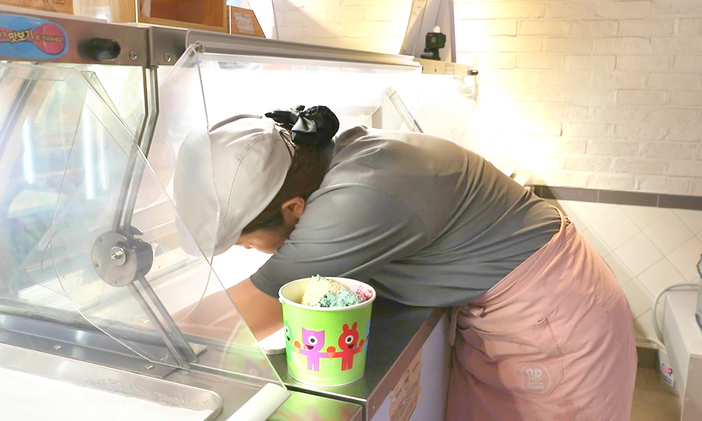 배스킨라빈스 아르바이트는 아이스크림을 예쁘게 담는 것에서부터 시작합니다. 쇼케이스 안에 아이스크림이 담겨있는 통을 텁(Tub)라고 부르는데요. 위생 안전을 고려해 이 텁을 매일매일 정리합니다. 많은 손님이 방문하는 날이면 하루 만에 한 통을 다 써버리기도 하지요. 아이스크림을 동그랗게 잘 담는 건 사실 한 달 정도면 금방 숙련되어 잘 할 수 있는데요. 저는 손목 스냅을 이용해서 동그랗게 만들어줘요.