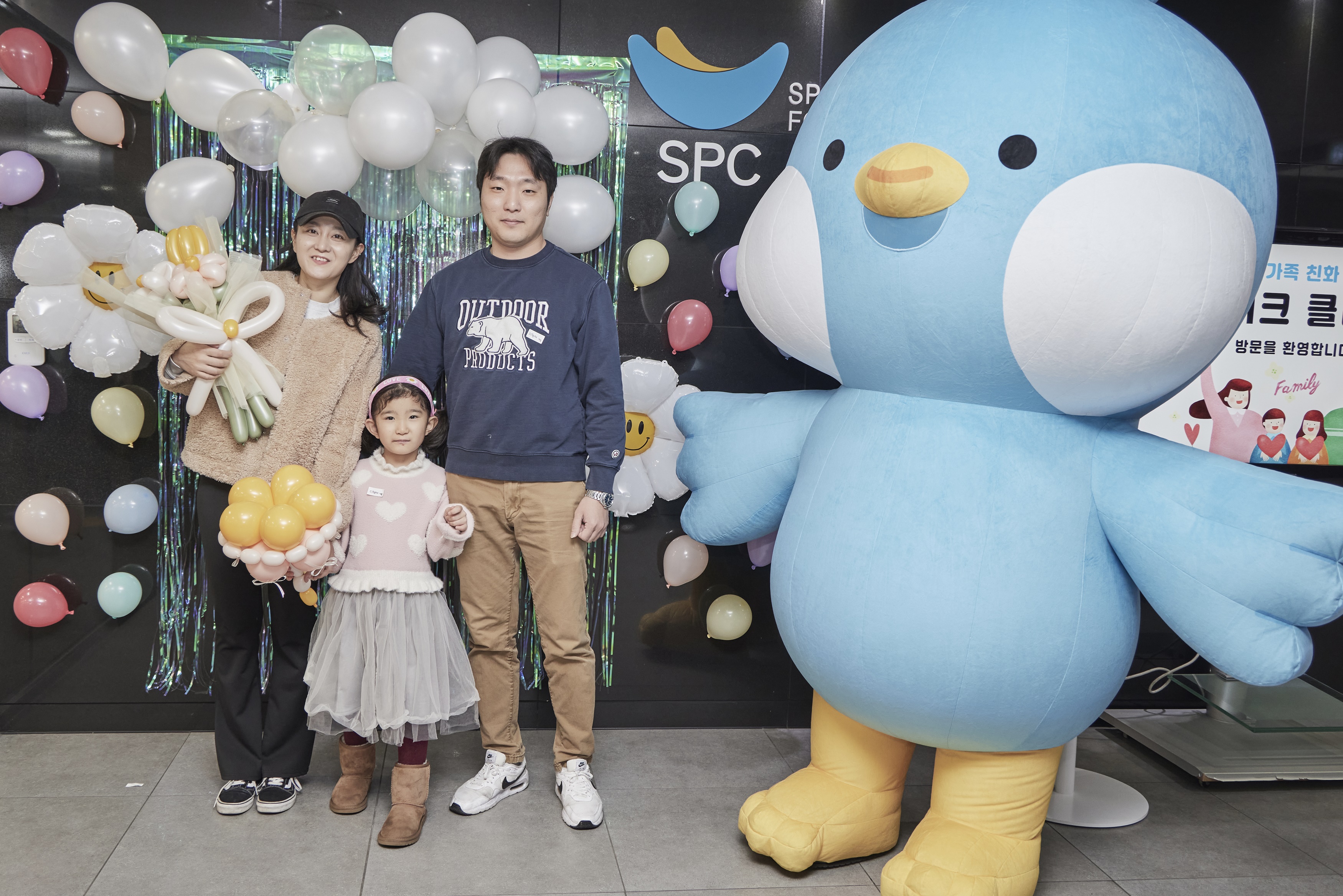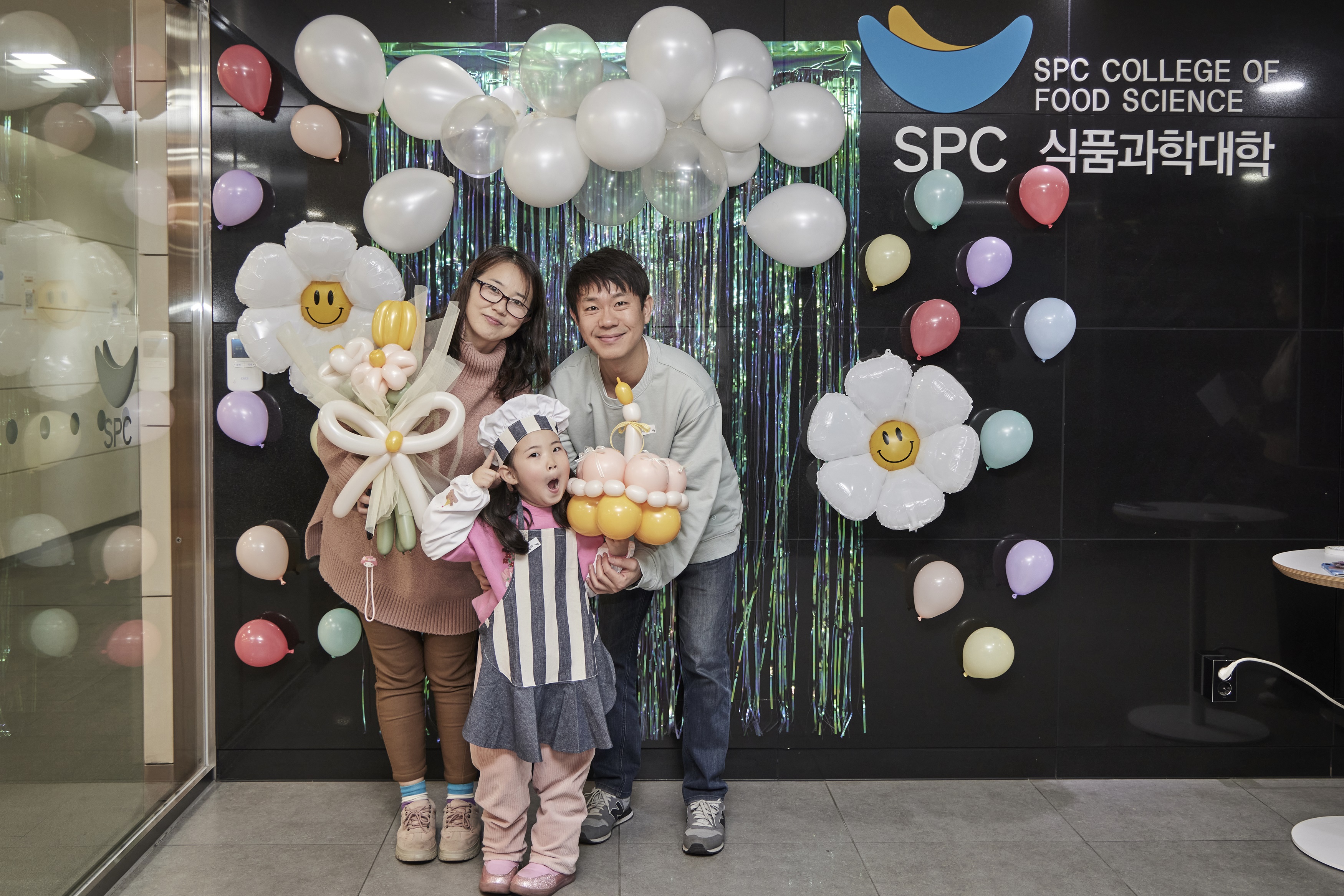 SPC 미래창조원 4층 식품과학대학 로비에 마련된 포토존에서 풍선 부케를 들고 사진을 찍는 가족들
