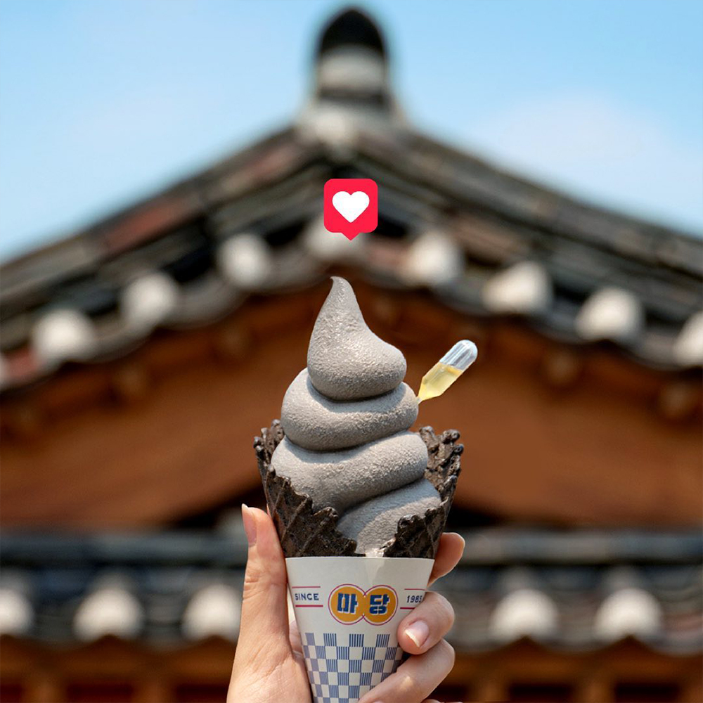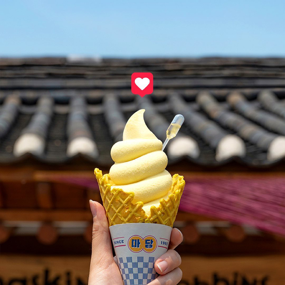 한국 전통 음식과 배스킨라빈스의 만남, 상상이 되시나요? 배스킨라빈스 삼청마당점에선 이 놀라운 조합이 실제로 이루어지고 있는데요. 콘셉트 매장인 배스킨라빈스 삼청마당점은 한국적인 식재료와 음식을 활용해 색다른 제품들을 선보입니다. 다양한 이색 메뉴들 중에서도 ‘마당 소프트 서브’는 아이스크림콘에 참기름 포션을 꽂은 비주얼로 눈길을 사로잡는데요. 옥수수, 흑임자 아이스크림의 구수하고 달콤한 맛과 참기름의 고소함이 의외로 완벽한 조화를 이룹니다.