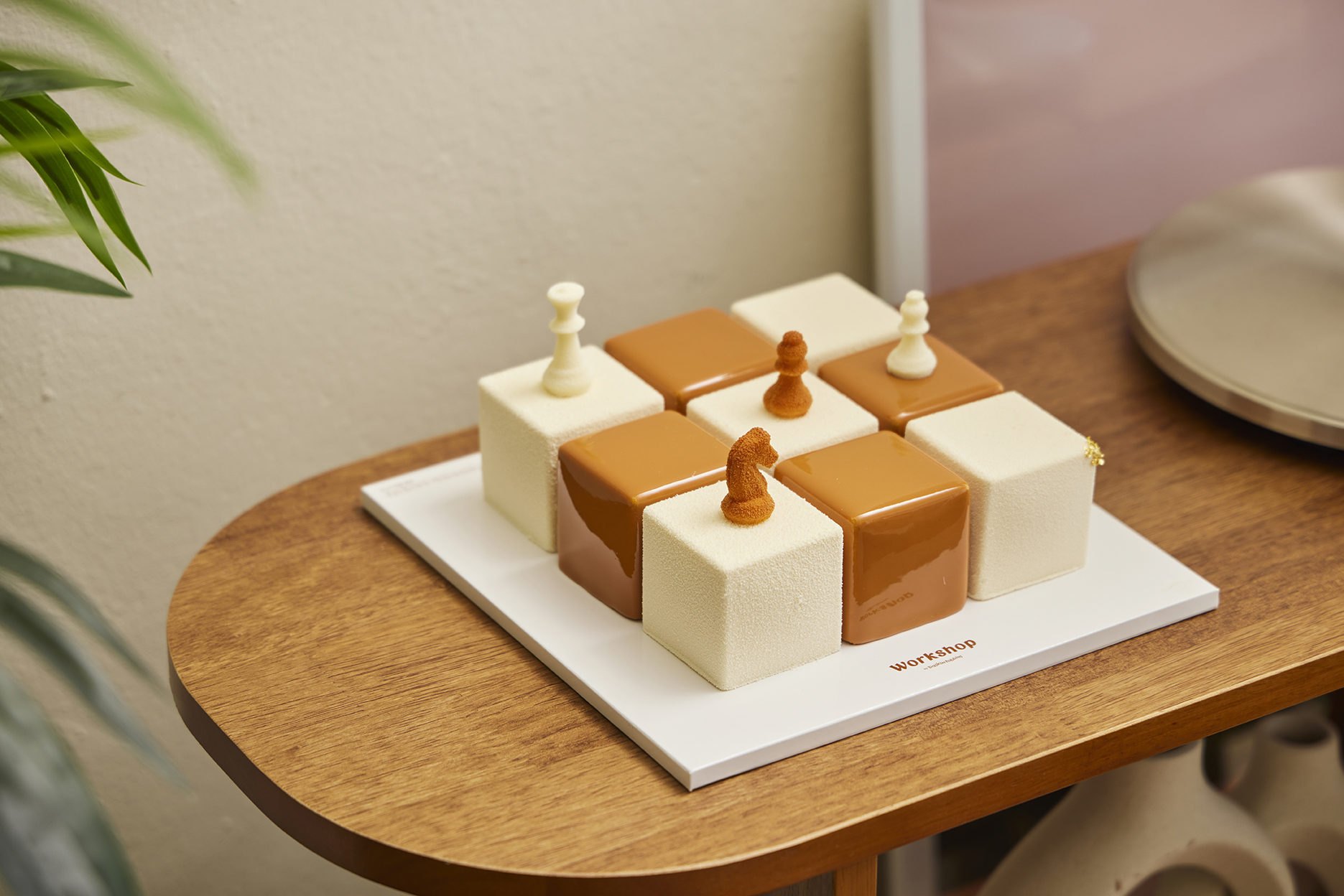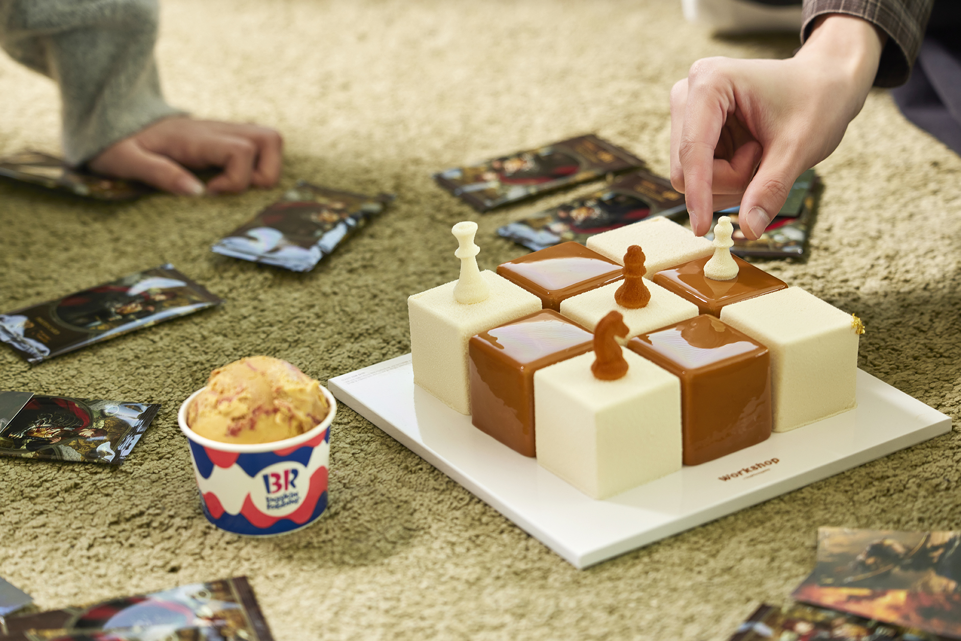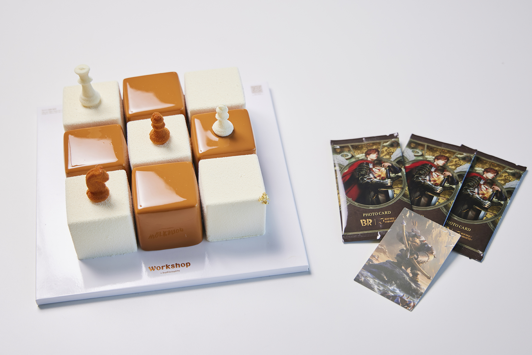 금빛 격자무늬의 체스보드✨를 모티브로 한 아이스크림 케이크! 큐브 모양의 아이스크림 조각과 체스말 모양의 초콜릿을 더해 실제 체스보드를 연상시키는 화려한 비주얼이 특징이에요. 해당 제품은 ‘워크샵 by 배스킨라빈스’에서만 한정 판매된다고 하니, 놓치지 마세요!