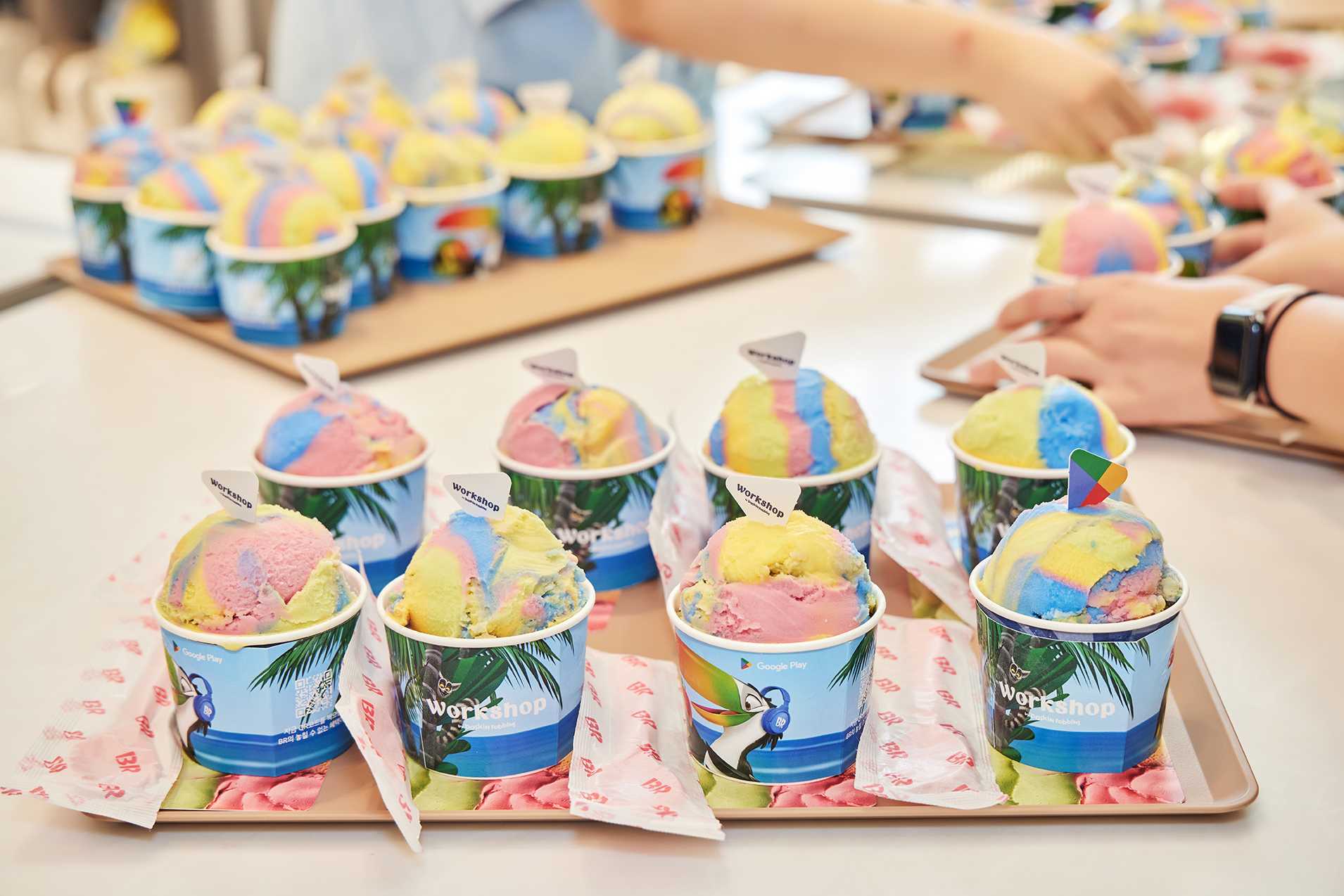 워크샵 바이 배스킨라빈스(이하 워크샵)에 모인 취재진을 비롯해 무더운 날씨에도 자리를 가득 메운 인파에서 새로 출시되는 ‘트로피컬 썸머 플레이’에 대한 관심을 알 수 있었습니다. 그도 그럴 것이 구글플레이와 배스킨라빈스의 협업이니까요!😄