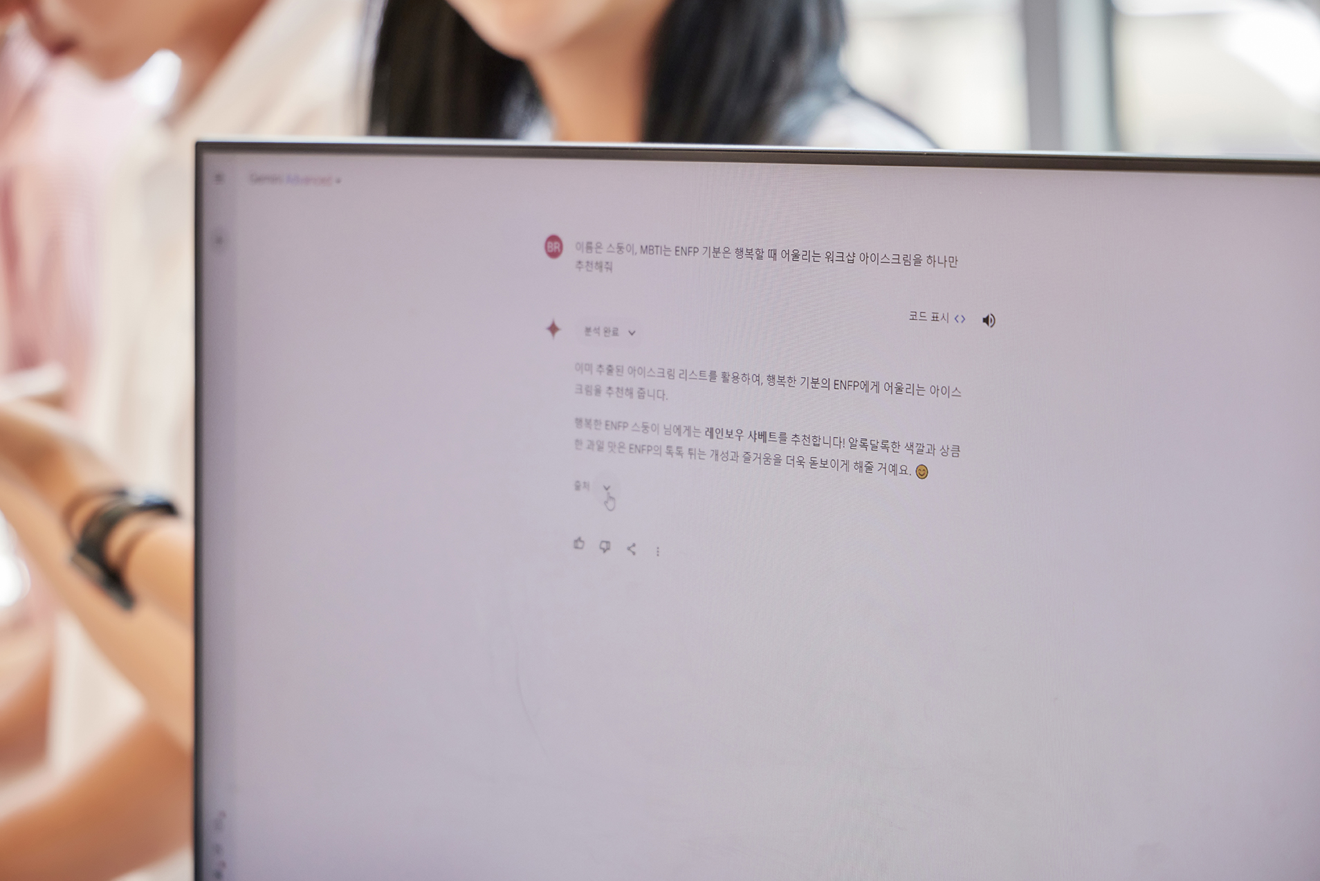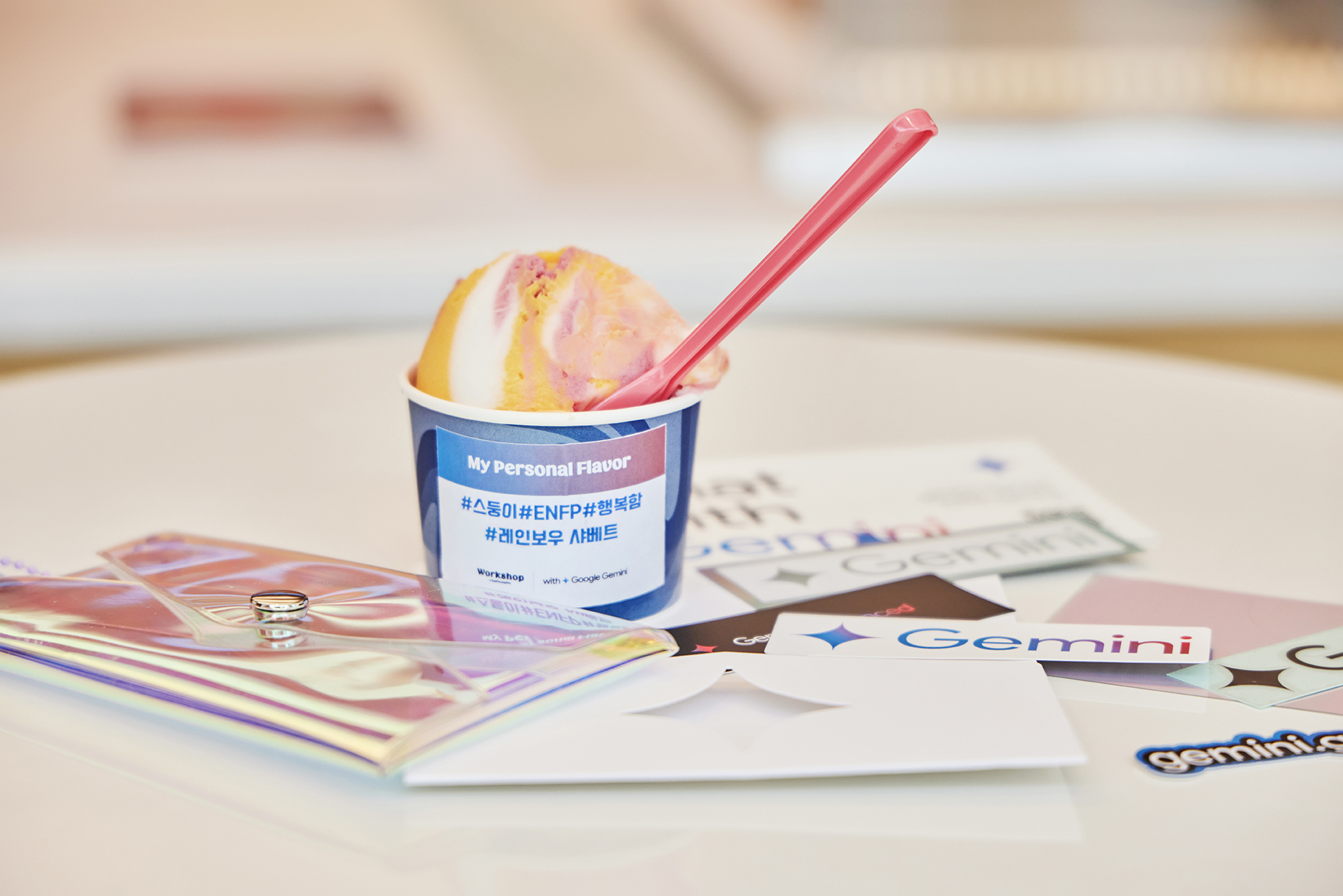 론칭쇼 못지않게 주목받은 또 다른 화제의 현장은 ‘마이 퍼스널 플레이버’ 부스였습니다. 제미나이를 활용해 수십 가지 워크샵 플레이버 중 자신과 맞는 아이스크림을 추천받을 기회였는데요. ‘제미나이 1.5 프로’에게 사용자의 이름과 MBTI, 오늘의 기분 등을 입력해 봤습니다. 과연 제미나이는 ‘스둥이’에게 어떤 플레이버를 추천해 줄까요.👀❔