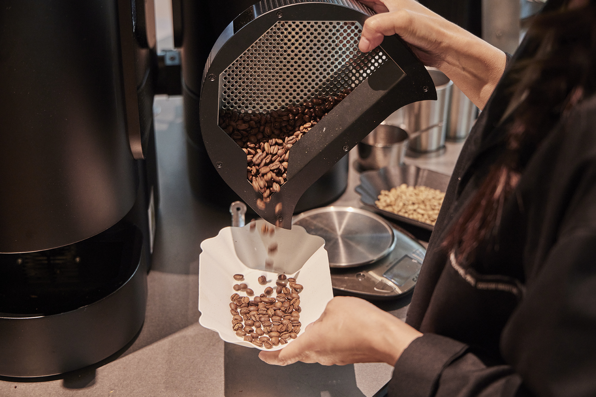 모든 선택이 끝나면, 전문 바리스타가 레시피에 맞춰 생두를 담고 로스팅하는 전 과정을 눈앞에서 확인할 수 있어요. 소요 시간은 조합에 따라 다르지만, 약 15~25분 후에 수령할 수 있습니다.