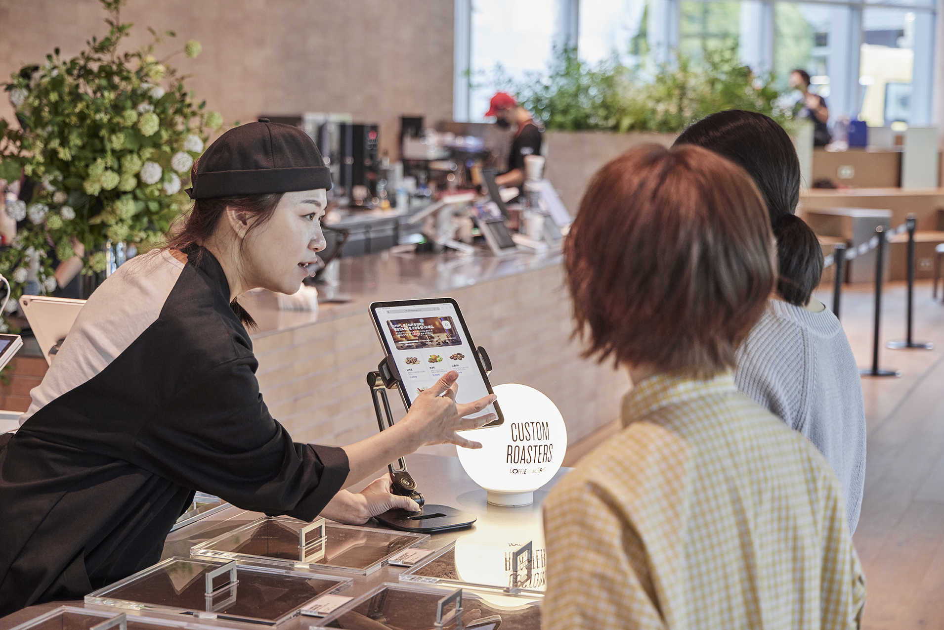 커스텀 로스팅 과정은 다음과 같은 단계로 진행됩니다. 매장 내 ‘커스텀 로스터리 존’에 비치된 태블릿을 통해 생두 선택부터 로스팅 포인트, 포장 방식까지 섬세하게 설정할 수 있죠. 다양한 산지와 가공 방식의 생두를 취향에 맞게 블렌딩해, 세상에 하나뿐인 나만의 커피를 완성해보세요!