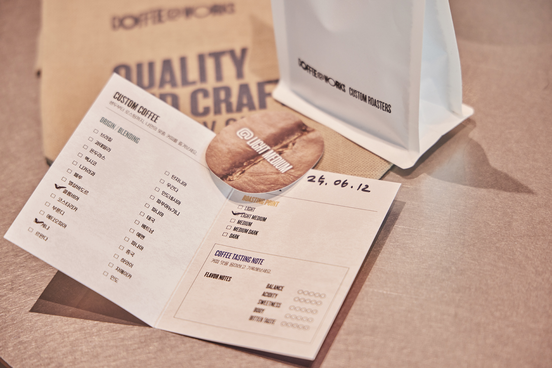 이렇게 완성된 커스텀 커피는 내가 선택한 생두와 로스팅 포인트가 모두 기록된 패키지에 담겨 나오는데요. 제조 날짜도 함께 표기돼, 신선한 원두의 향과 맛 가장 좋은 시기에 즐길 수 있죠.