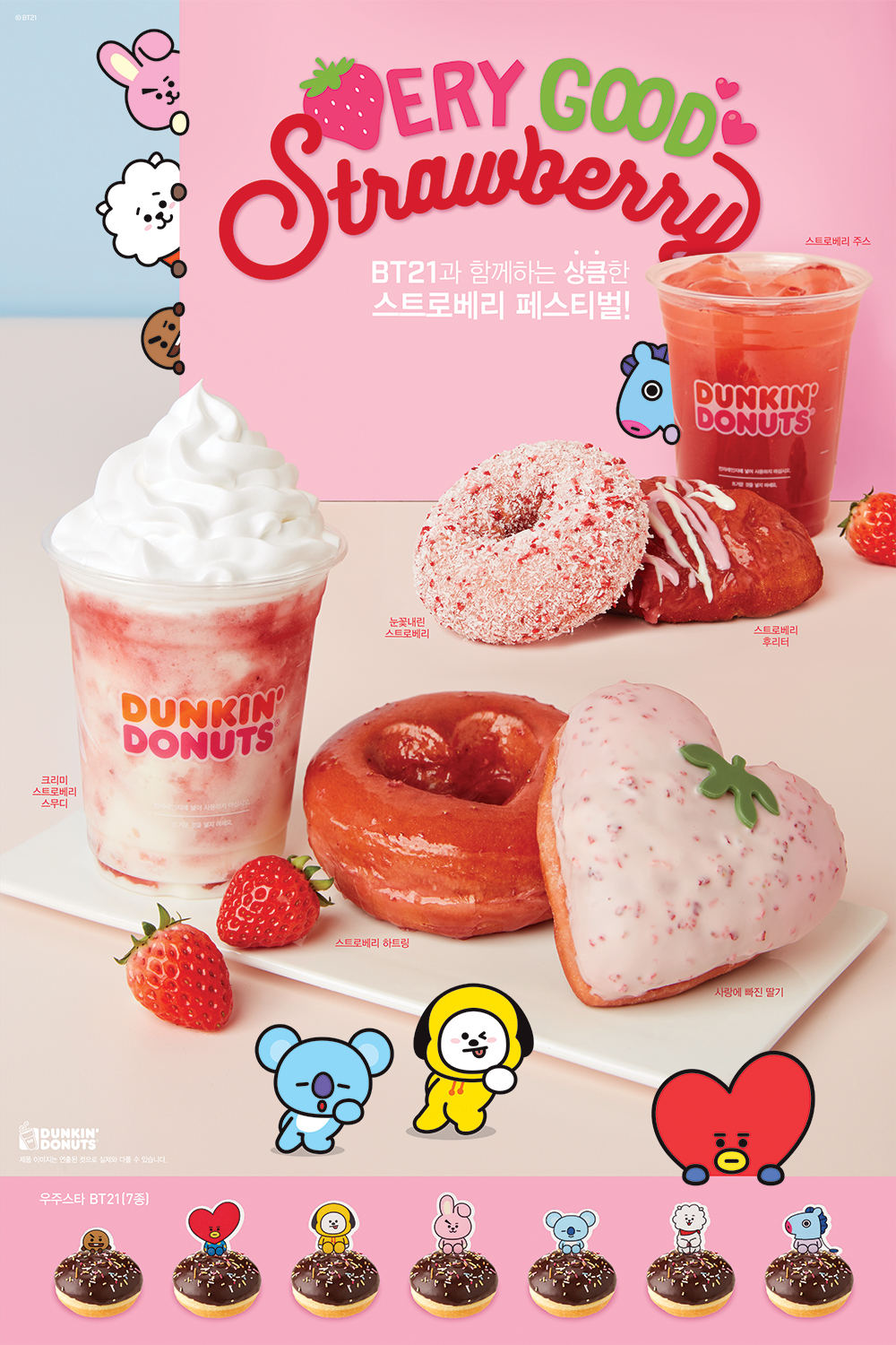 던킨도너츠 관계자는 “앞으로 약 한 달간 던킨도너츠 매장에서 ‘BT21’캐릭터와 함께하는 다양한 프로모션이 펼쳐질 예정” 이라며 “첫 번째로 진행되는 스트로베리 페스티벌에 많은 관심 부탁 드린다.”고 말했다.