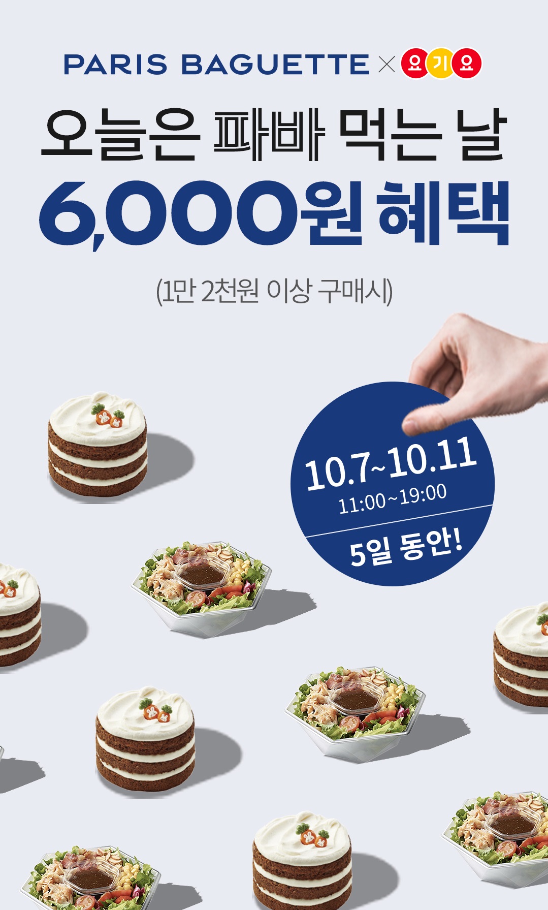 파리바게뜨의 배달 서비스인 ‘파바 딜리버리’가 배달앱 요기요와 함께 제휴 프로모션을 진행한다고 7일 밝혔다. 파리바게뜨는 10월 7일부터 11일까지 총 5일 동안 소비자가 요기요 어플리케이션을 통해 파리바게뜨 제품을 1만 2천원 이상 주문하면 최대 6천원을 할인해준다. 요기요 앱에서 ‘파리바게뜨 전용 쿠폰(6천원 할인)’을 다운로드 받아 오전 11시부터 오후 7시까지 제품을 주문할 수 있으며, 요기요 슈퍼클럽 회원의 경우, 추가로 3천원 자동 할인까지 중복 적용된다.