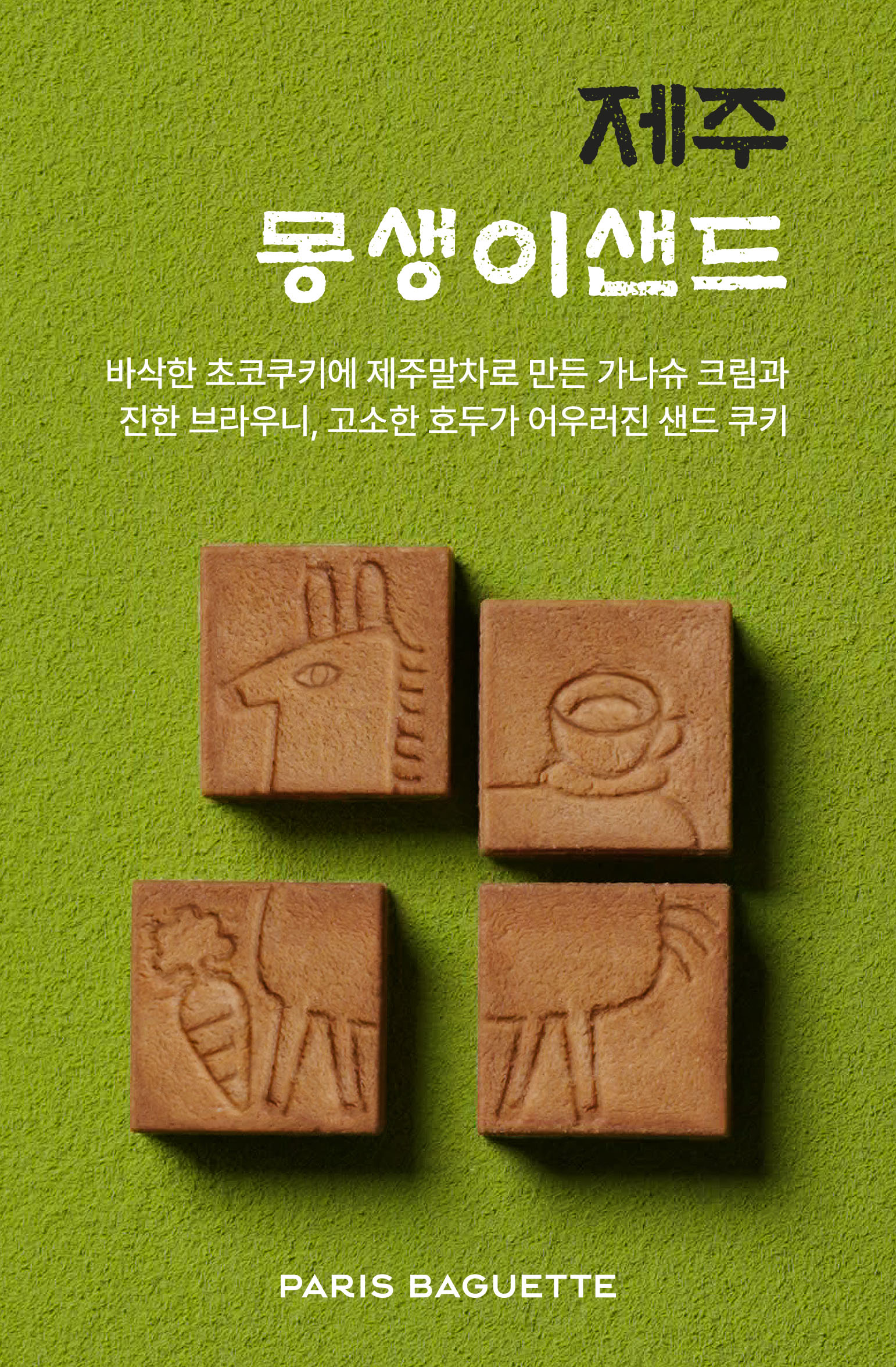 ‘제주 몽생이 샌드’는 바삭한 초콜릿 버터쿠키 사이에 제주도의 푸름을 담은 제주 말차 버터크림과 촉촉한 브라우니가 함께 들어가 쌉쌀하면서도 달콤한 맛의 조화가 일품이다. 또한 쿠키 겉면에는 ‘몽생이’ 캐릭터를 4가지의 랜덤 인장으로 새겨 넣어, 퍼즐처럼 맞춰지는 재미 요소를 더했다. 이번 신제품은 파리바게뜨 동화마을점에서만 일 한정 수량으로 판매될 예정이다.