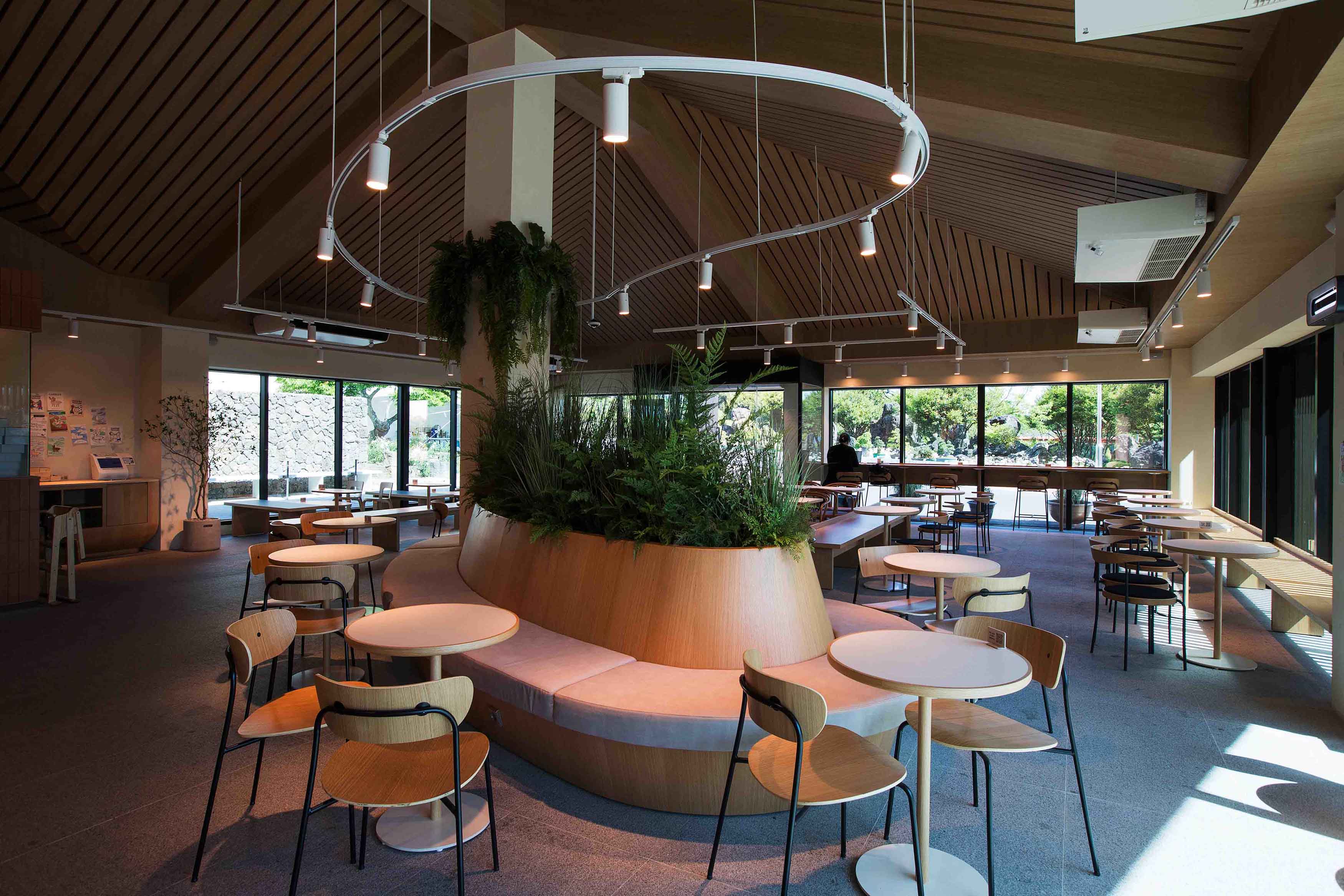 101석의 넓은 공간과 통창을 갖춘 단독 건물 매장으로 여유와 개방감을 느낄 수 있으며, 식물을 적극 활용한 인테리어를 통해 자연친화적 감성을 느낄 수 있다.