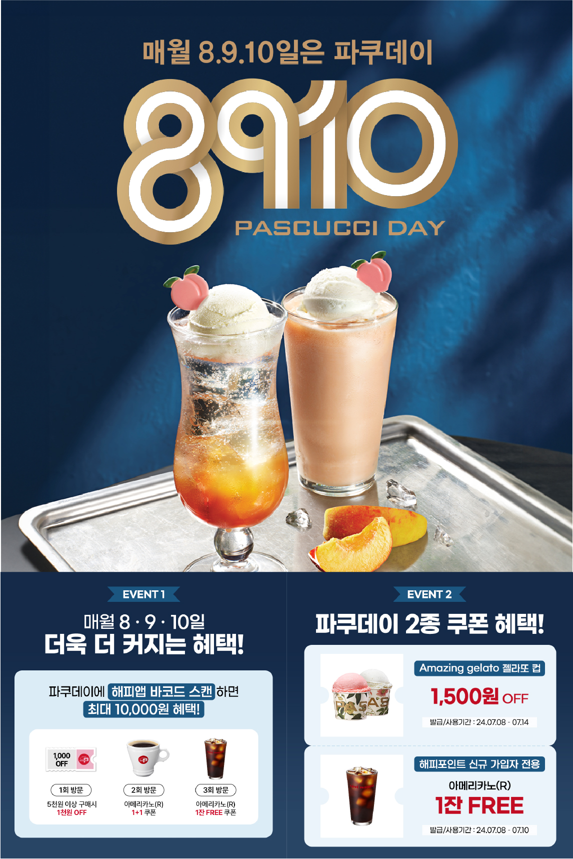 먼저 7월 ‘파쿠데이’ 기간에는 파스쿠찌 매장을 방문하여 제품 구매 시 해피앱 바코드를 스캔하면 스탬프가 적립된다. 방문 횟수에 따라 최대 1만원의 혜택을 제공하며 첫 번째 방문 시 ‘1000원 가격 혜택 쿠폰’, 두 번째 방문 시 ‘아메리카노(R) 1+1 쿠폰’, 세 번째 방문 시 ‘아메리카노(R) 1잔 무료 쿠폰’을 받을 수 있다. 스탬프는 4000원 이상의 제품 구매 시 하루 최대 한 번 적립 가능하며, 발급받은 쿠폰은 유효기간 내에 파스쿠찌 전 매장에서 사용할 수 있다.