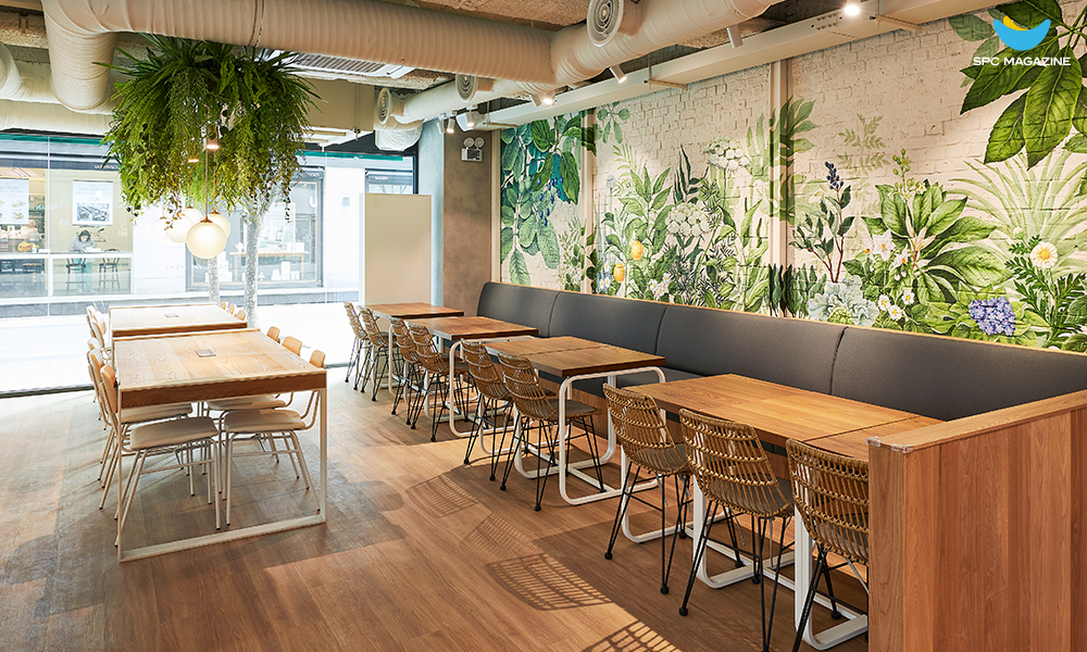 은은한 오렌지빛 조명이 감도는 매장 내부로 들어서면 마치 유럽의 한 실내 정원에 온 듯한 기분을 느낄 수 있는데요. ‘도심 속 정원’이라는 콘셉트에 맞춰 매장 곳곳에 다양한 식물을 배치하고 보타니컬 아트(Botanical Art, 식물화)로 벽을 장식했습니다. 싱그러운 분위기 속에서 즐기는 건강한 샐러드 한 끼는 바쁜 일상 속에 리프레시를 선사하는데요. 오픈 키친을 통해 위생적인 조리 과정과 신선한 식재료를 고객들이 한눈에 확인할 수 있습니다.