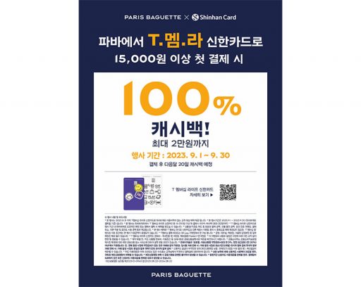 (주)파리크라상, 보도자료2023. 09. 11T멤라 신한카드 첫 이용자들을 위해 파바가 전하는 파격적인 혜택! 파리바게뜨, ‘T멤라 신한카드 프로모션’ 통해 100% 캐시백 혜택 see more..