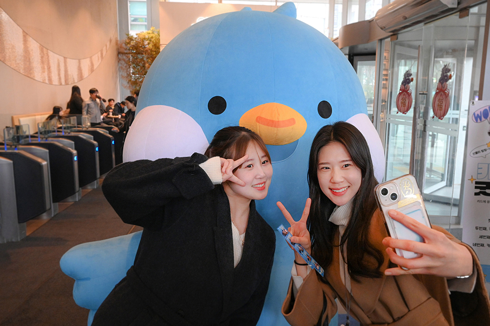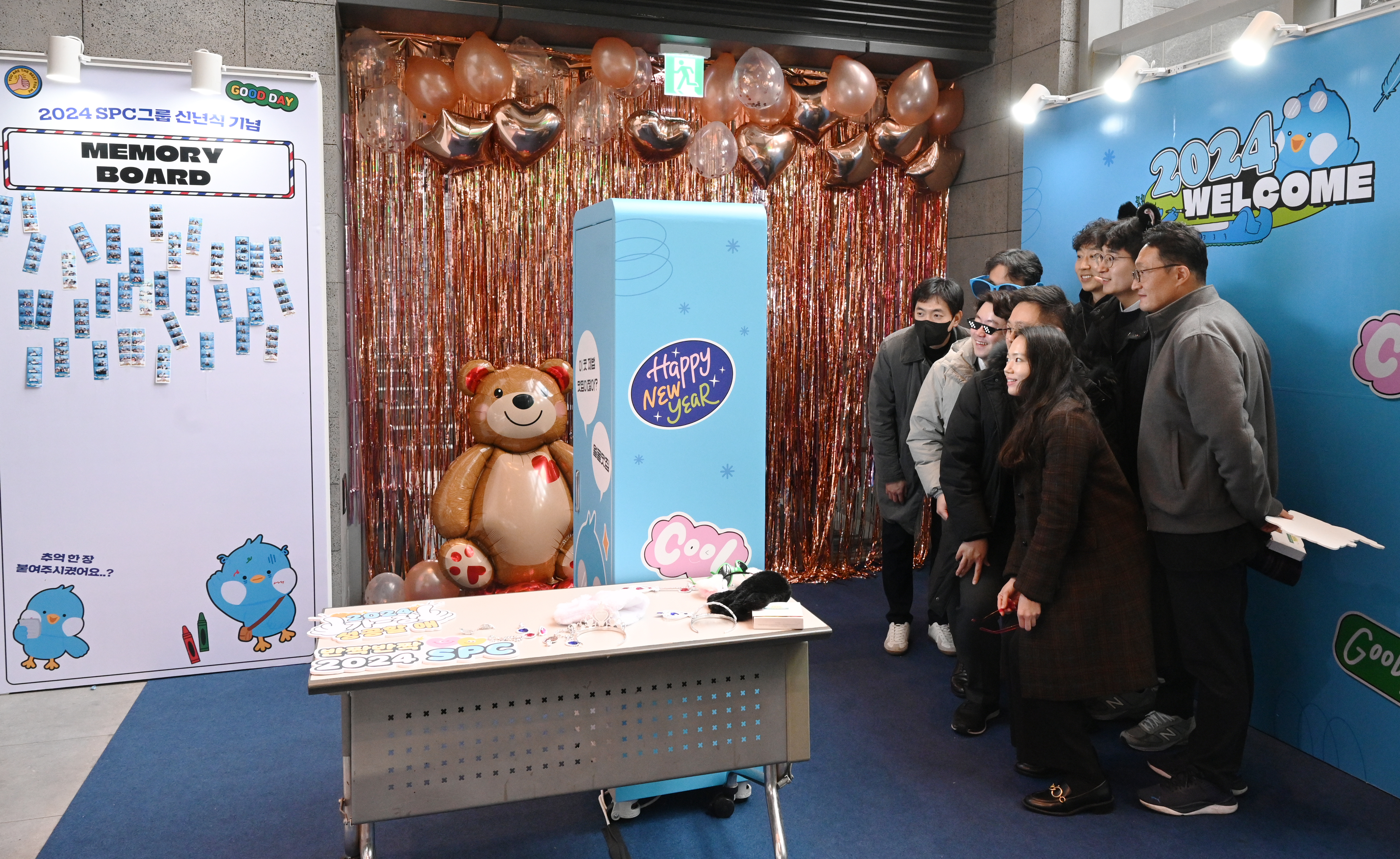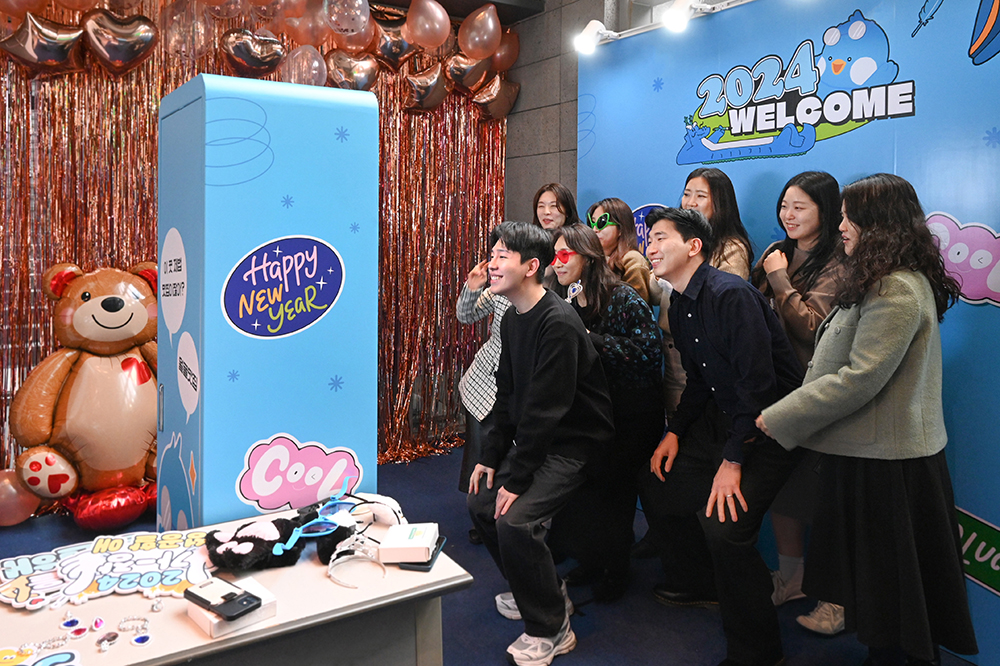 로비에서 그루비와 함께 즐기며 소망카드도 쓰고, 회사에 메시지도 남겼다면 이제 지하 1층에 마련된 ‘포토부스’에서 사진을 찍어 볼까요? 사실 가족보다 더 자주 보는 직장동료지만, 이렇게 갖춰진 부스에서 사진 찍을 기회는 많지 않잖아요? 인생네컷에 견줘도 밀리지 않을 포토부스에는 다양한 촬영용 소도구들까지 준비되어 있어 분위기를 더욱 뜨겁게 달궜습니다.