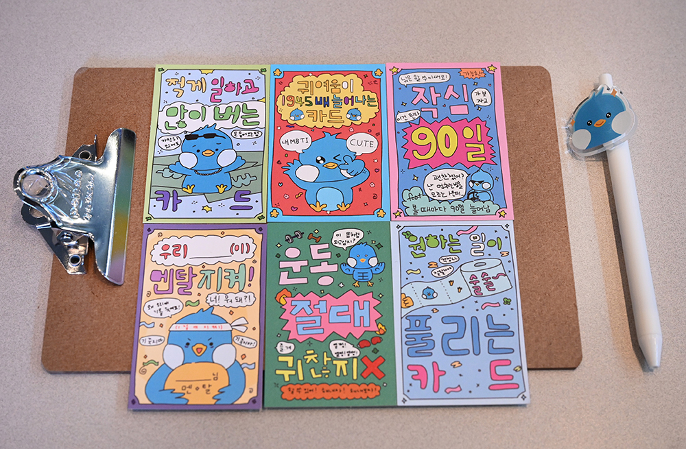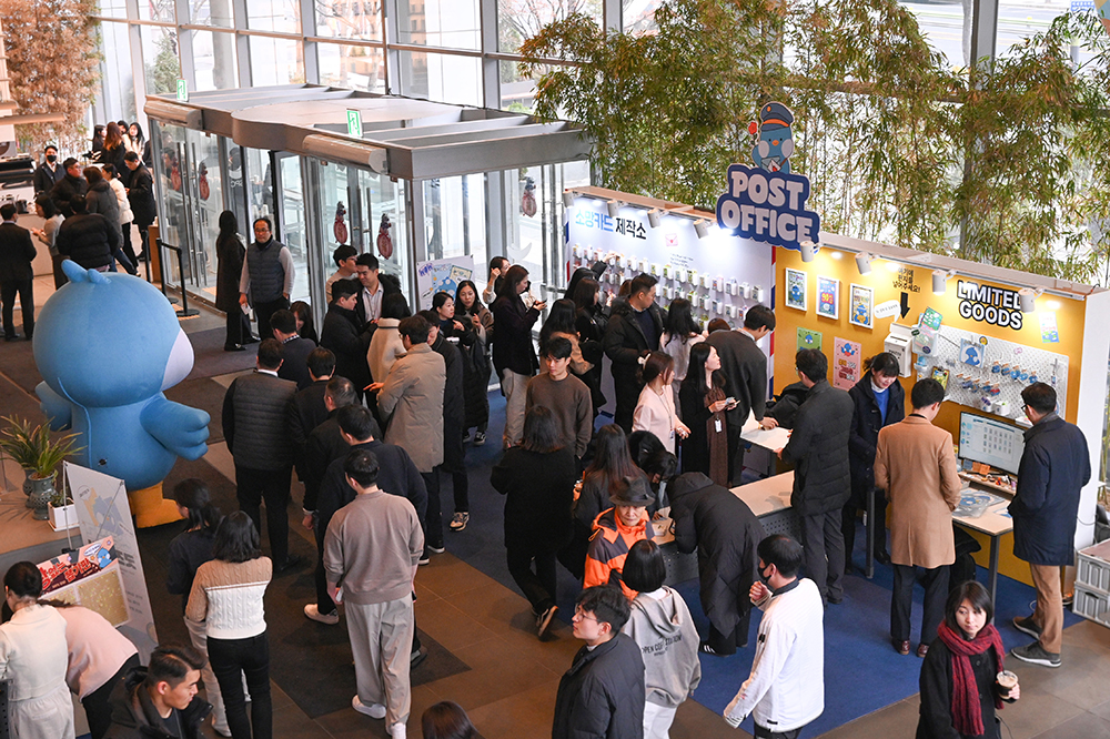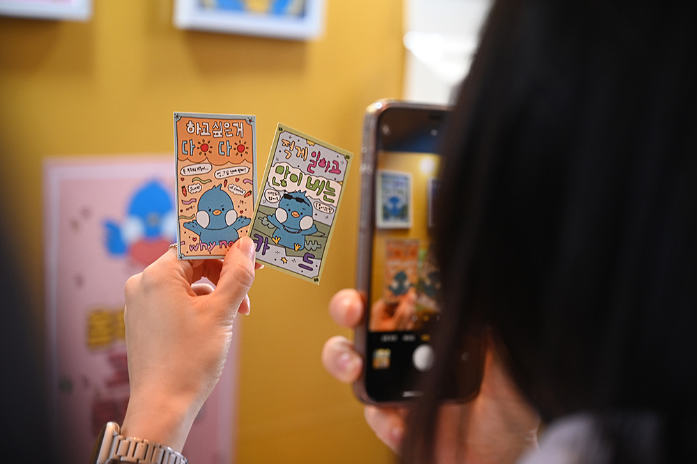 그루비와 사진을 찍은 후 가장 먼저 마주한 부스는 ‘소망카드 제작소’입니다. 총 20가지의 소망카드 중 나와 내 동료를 위한 카드를 한 장씩 뽑을 수 있는데요. 무엇보다 MZ세대 직원들도 감탄한 재치 있는 문구와 세련된 디자인의 카드가 눈길을 사로잡았습니다. ‘적게 일하고 많이 버는 카드’, ‘우리 OO 멘탈 절대 지켜’, ‘귀여움이 1945배 늘어나는 카드’, ‘원하는 일이 풀리는 카드’ 등의 센스 있는 문구는 기본! 그루비를 활용한 귀엽고 세련된 디자인이 임직원들의 소장 욕구까지 자극했다는 후문. 깨알같은 재미와 의미있는 메시지가 포함된 카드들 중 어떤 카드를 골라 내 동료에게 줄지 고민을 할 수밖에 없었네요!