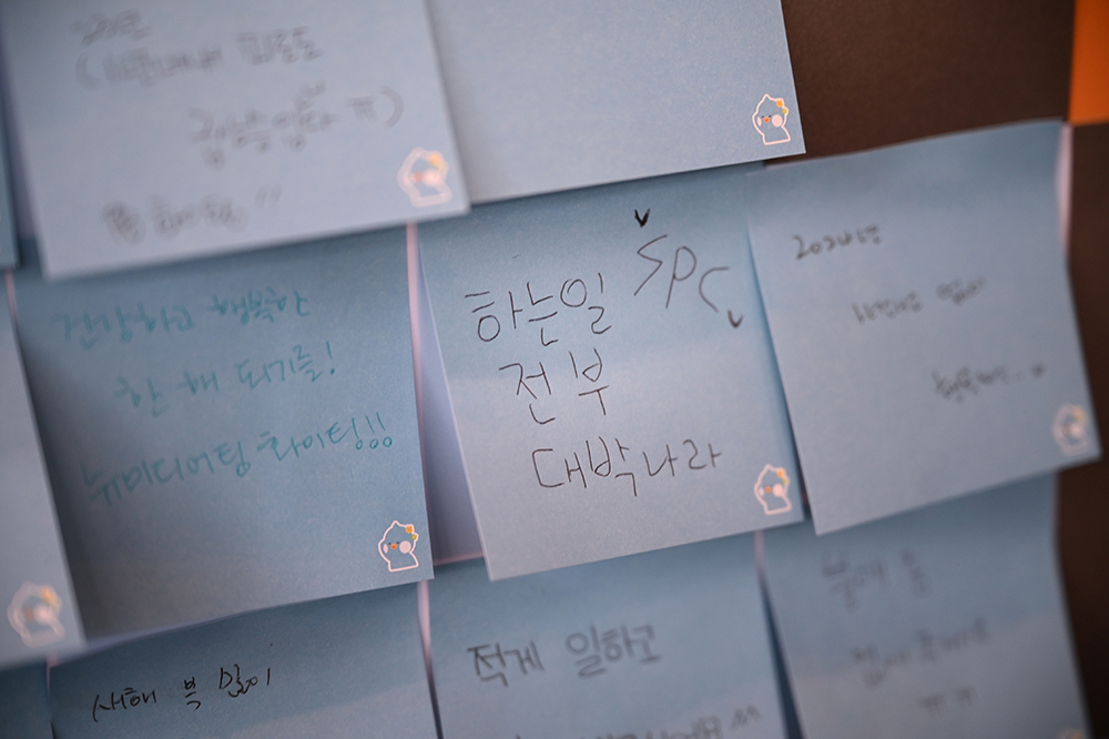 이제 회사에 바라는 소망을 포스트잇에 적을 차례! 소망카드 제작소 건너편에는 새해에 회사에 바라는 소망을 전달하는 ‘2024 Happy New SPC 소망월’이 마련되었는데요. 그루비가 크게 그려진 판넬은 무려 770개 의견을 붙일 수 있도록 구성되었습니다.