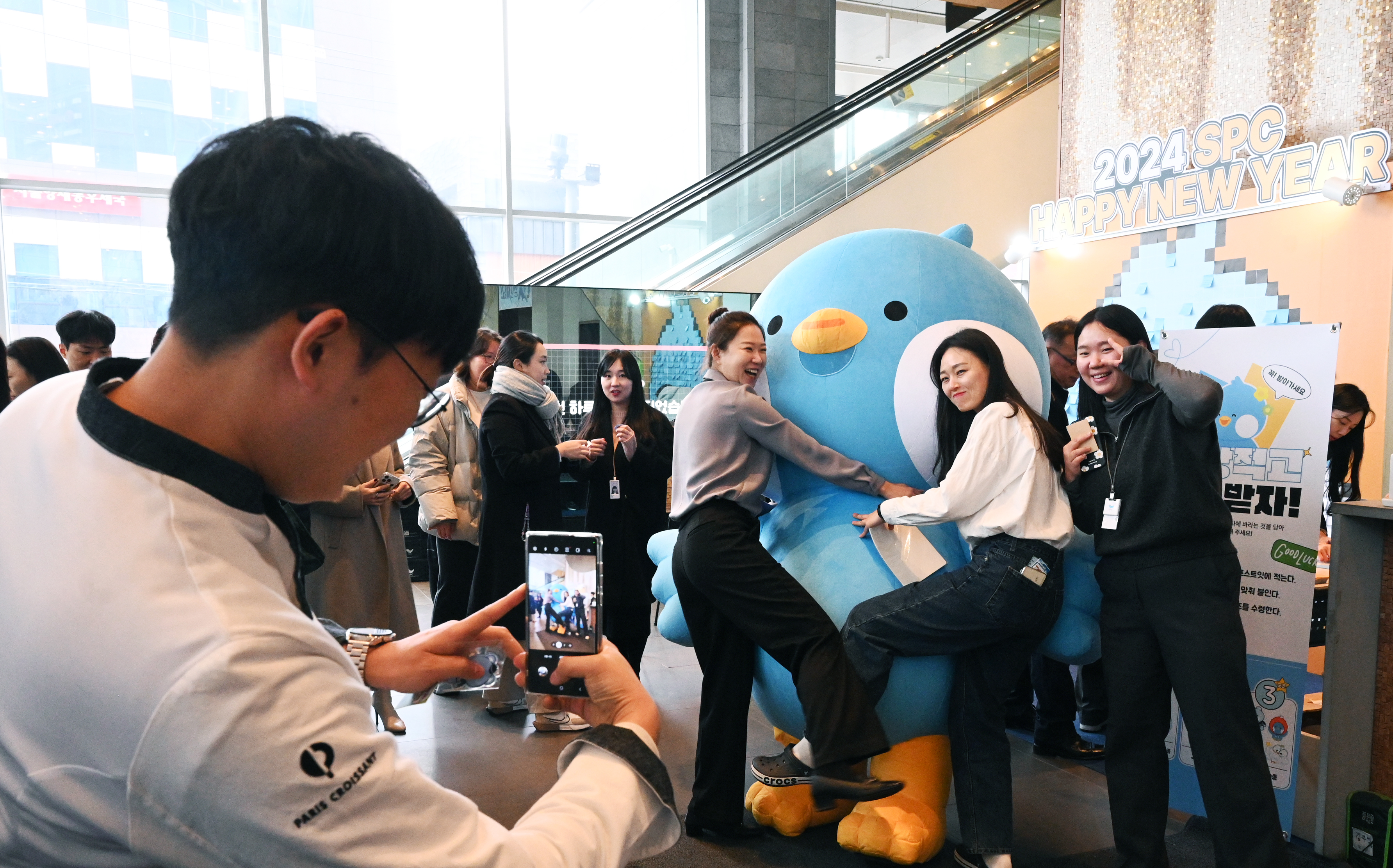 SPC의 기업문화를 위해 청룡의 해에도 열심히 일할 예정인 ‘그루비’가 이 뜻깊은 행사에 빠질 수 없죠? 너무 귀여워서 보기만 해도 행복해지는 그루비가 1층 로비에서 맞이해주니, 행사의 분위기도 up! 덩달아 새해에는 뭐든 다 잘될 것 같다는 느낌이 공간을 가득 채우며, 기분 좋은 시작을 알렸습니다. 그루비와 인증사진은 필수! 즐거운 순간을 남기기 위해 모여드는 임직원들로 1층 로비는 어느 순간 발 디딜 틈이 없네요.