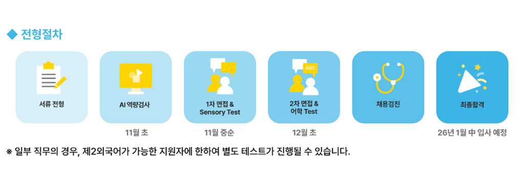 서류 접수는 10월 1일부터 10월 16일까지 진행되며, 이후 AI역량검사(11월 초), 1차 면접 및 Sensory Test(11월 중순), 2차 면접 & 어학 Test(12월 초), 채용검진을 거쳐 최종 합격자를 발표할 예정입니다. 📢