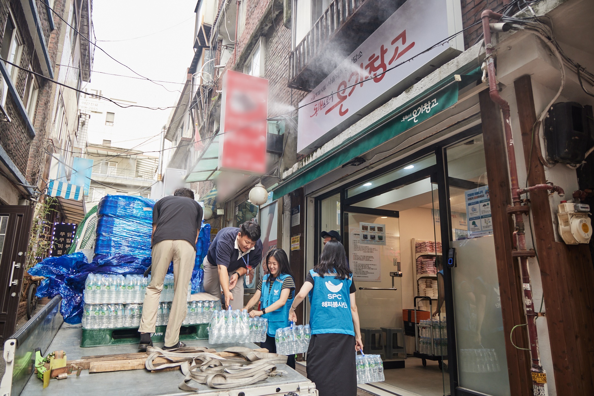 서울역쪽방상담소가 운영하는 나눔스토어 ‘온기창고’에서 생수를 전달하는 SPC그룹 임직원들