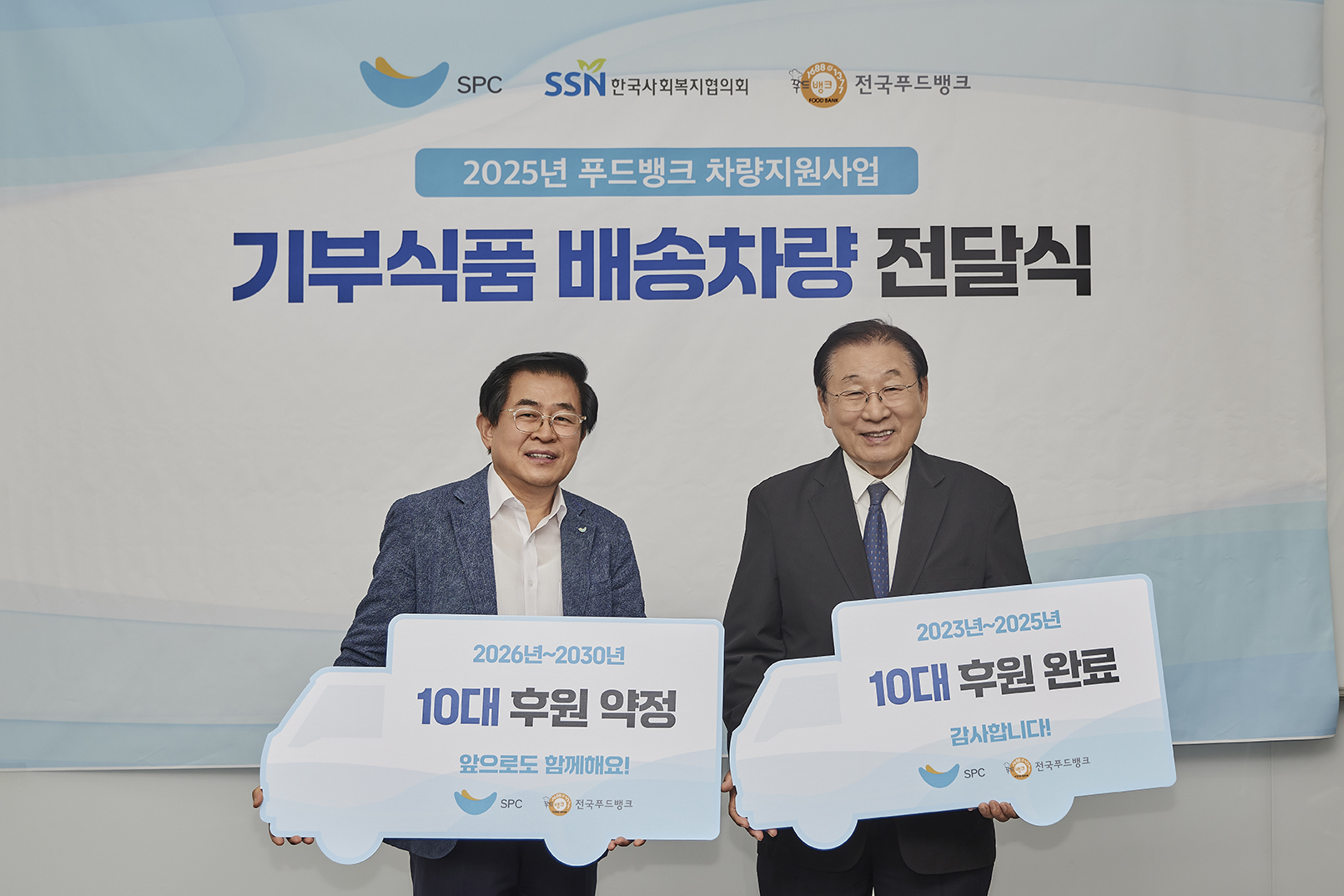 지난 8월 18일 서울 동작구 SPC미래창조원에서 열린 차량 전달식에는 도세호 SPC 대표이사와 김성이 한국사회복지협의회 회장이 참석해 식품 배송용 냉동탑차 2대를 전달했습니다. 이 자리에서 SPC그룹은 향후 5년간 10대의 차량을 추가로 지원하겠다는 계획도 밝혔습니다.🚗