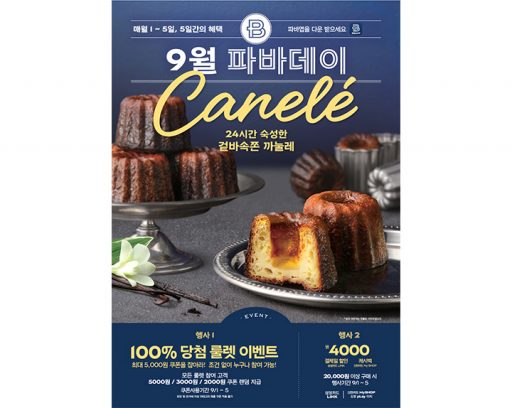 (주)파리크라상, 보도자료2023. 08. 319월 파바데이에서 진한 풍미의 ‘겉바속쫀’ 까눌레를 만나보세요! 파리바게뜨, 가을 맞이 9월 ‘파바데이’ 프로모션 진행 see more..