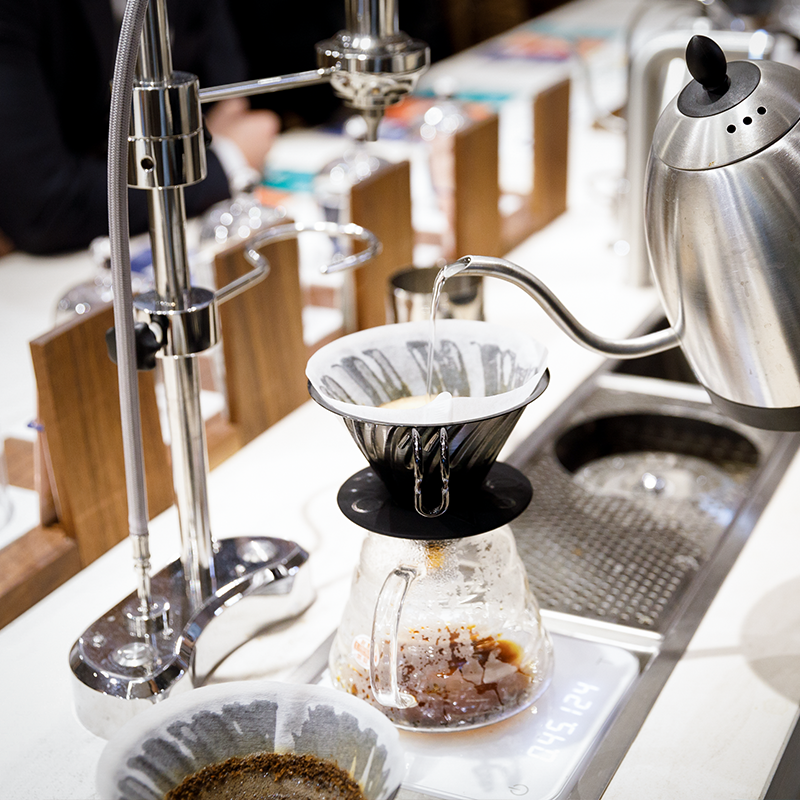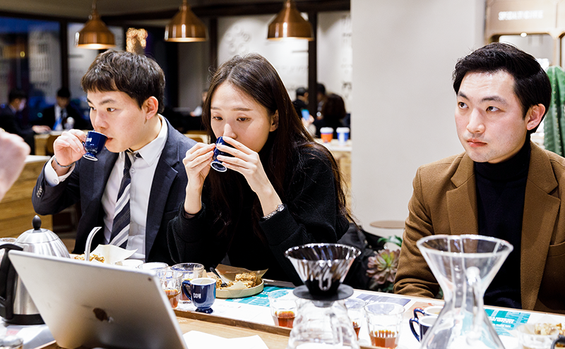 l 핸드드립으로 내린 싱글 오리진 커피를 시음하는 직원들