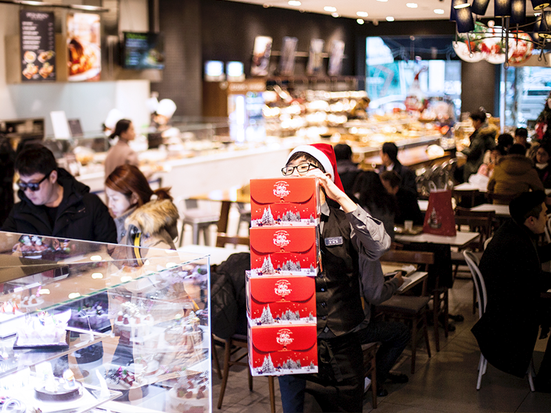 ㅣ크리스마스 케이크 박스를 옮기고 있는 파리바게뜨 카페강남중앙점 직원의 모습