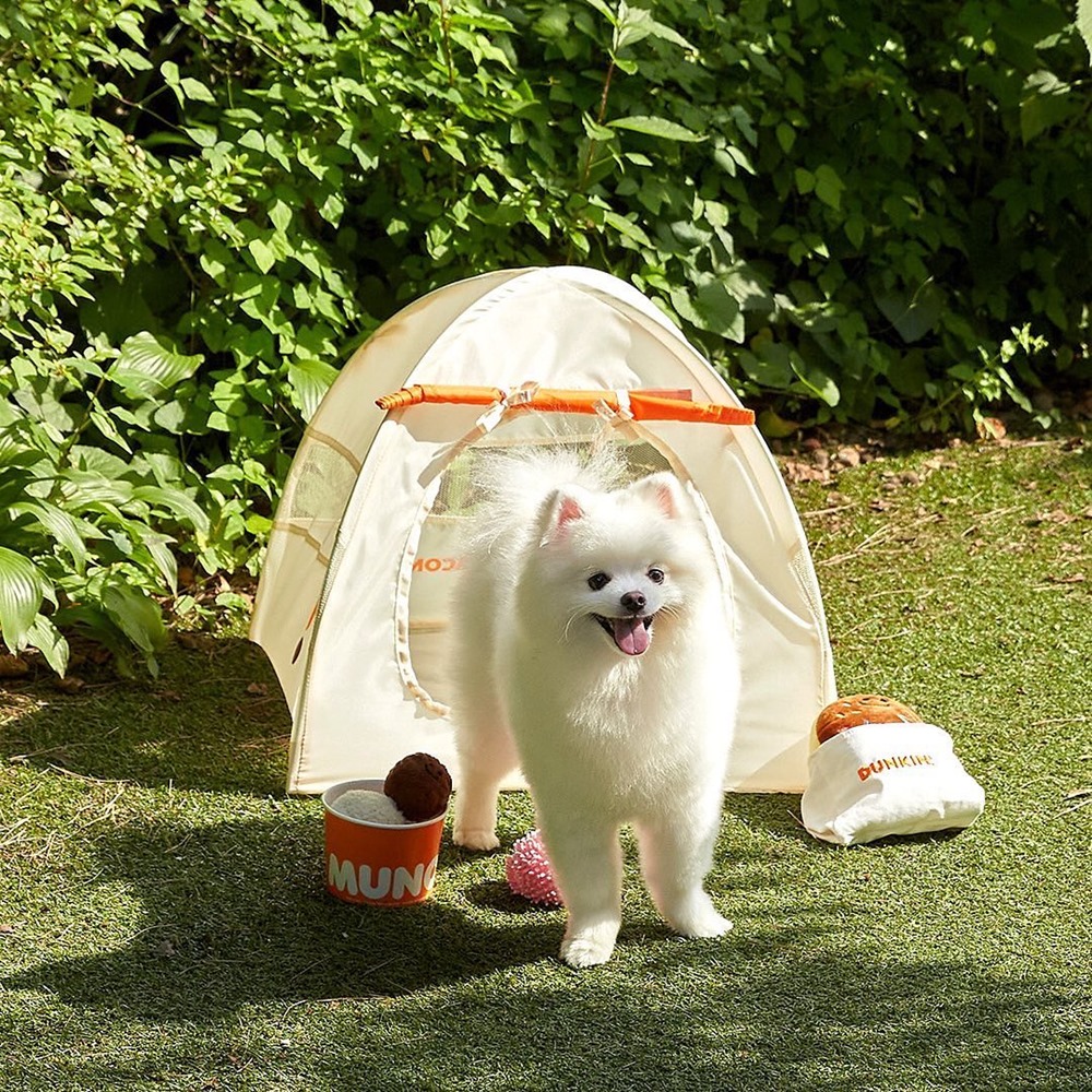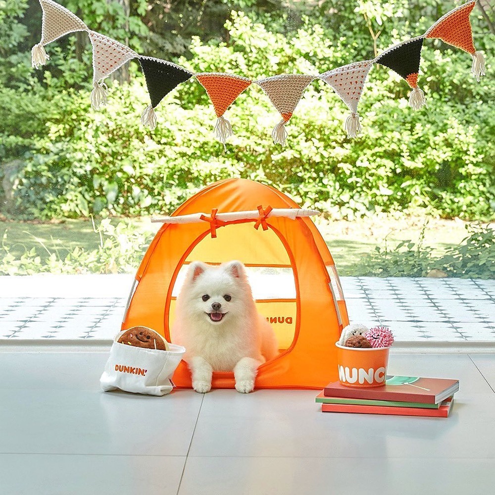 던킨에서는 지난 7월 반려동물을 키우는 고객들을 위한 한정판 굿즈를 출시해 화제를 모았습니다. 반려용품 커머스 플랫폼 ‘베이컨박스’와 협업하여 텐트 형태의 ‘원터치 펫하우스’를 던킨만의 감성으로 제작한 건데요. 원터치 펫하우스는 언제 어디서나 간단하게 펼쳤다 접을 수 있고, 반려동물이 편안하고 아늑하게 쉴 수 있도록 넉넉한 사이즈로 설계됐습니다. 손잡이가 달린 패키지를 함께 구성해 여름 휴가 등 야외활동에도 최적화됐는데요. 오렌지와 아이보리, 총 두 가지 컬러로 선택의 폭을 넓혔습니다. 이번 굿즈는 펫팸족의 휴가철 라이프스타일을 세심하게 고려했다는 호평과 함께, 올여름 반려동물들의 완판템으로 등극했는데요. 던킨의 펫팸족 취향 저격은 여기서 그치지 않았습니다.