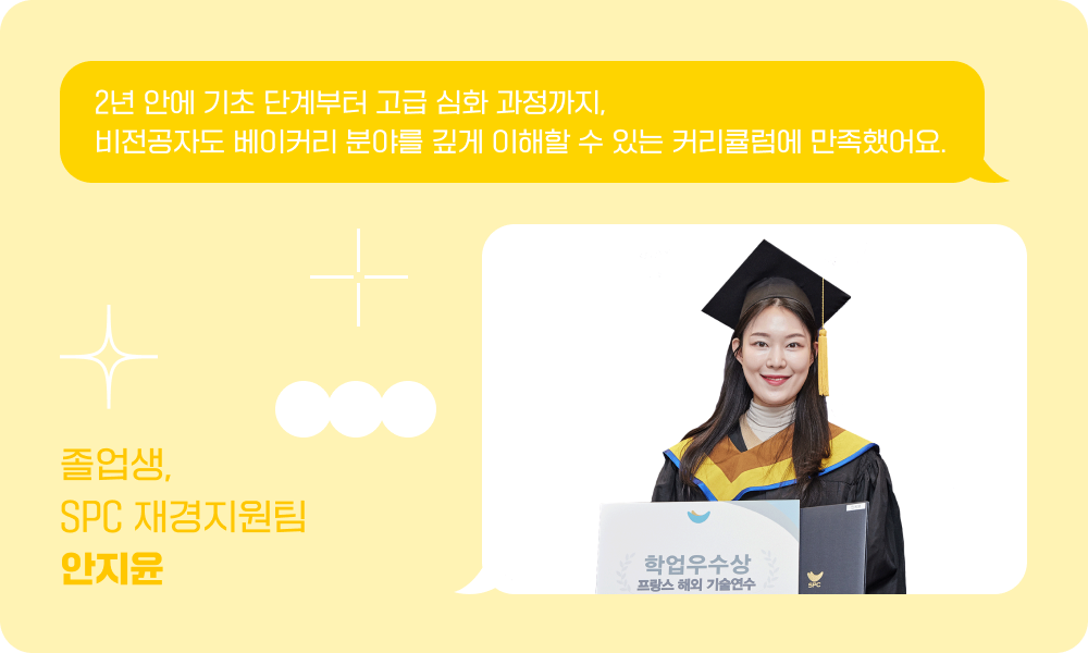 2년 동안 노력했던 부분이 교육부 장관상을 받는 좋은 결과로 이어져 너무 감사합니다. SPC식품과학대학에서 공부하면서 유익했던 부분은 바로 실습입니다. 비전공자이다 보니까 실질적으로 베이커리 수업이 만드는 수업이 가장 어렵기도 했지만, 저에게 도움이 많이 된 부분입니다. 비전공자도 베이커리에 대한 이해를 할 수 있도록 기초 단계부터 고급 심화 과정까지 2년 안에 다 배울 수 있어서 좋은 기회가 되었습니다.