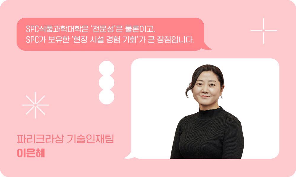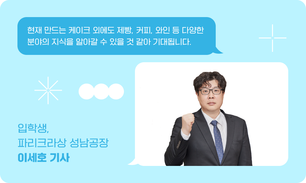파리크라상에서 11년 근무했지만, 부족한 부분을 많이 느끼고 있었는데요. 신입 사원이 물어오는 이론적, 실전적 관련 질문에 대해 시원하게 대답을 못 해줄 때 부족함을 느끼곤 했습니다. 앞으로 SPC식품과학대학을 다니면서 제가 이론과 실기 쪽으로 다양한 많은 지식과 정보를 얻으면, 업무 관련 질문을 받았을 때 조금 더 수월하게 가르쳐 줄 수 있을 것 같습니다.