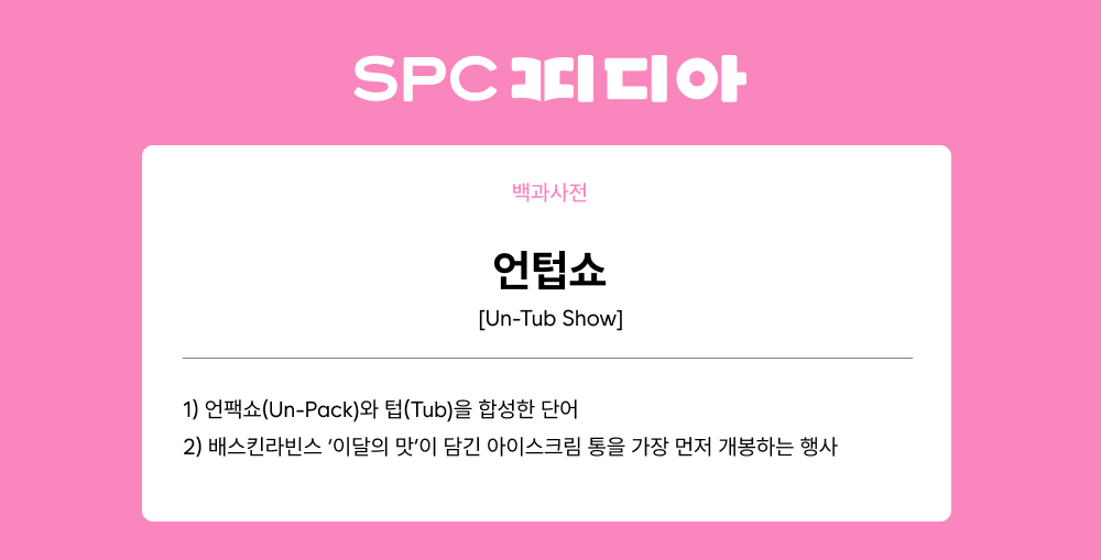 언텁쇼는 제품과 서비스를 가장 먼저 선보이는 ‘언팩쇼’의 개념을 배스킨라빈스에 맞게 변형한 행사인데요. ‘텁’은 배스킨라빈스 매장에서 유통되는 아이스크림 한 통을 의미하며, 매달 새롭게 출시하는 이달의 맛 아이스크림 텁을 최초로 공개하고 맛보기 위해 기획됐습니다.