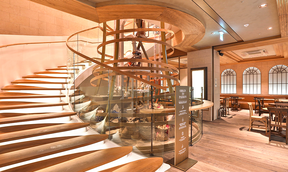 (상단) 곡선형의 계단, 매장에 들어서면 빵을 만드는 과정을 직접 볼 수 있어요. (하단) 지하 1층에는 디저트와 함께 즐길 수 있는 이국적인 분위기의 테라스가 조성되어 있어요.
