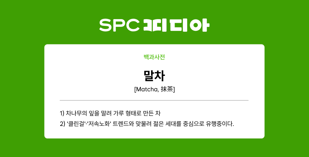 감탄을 자아내는 음식의 세계, 이해를 돕는 다양한 사진, 흥미진진한 이야기와 최신 트렌드까지. 생활 속 상식을 풍성하게 해줄 SPC피디아, 7월의 맛있는 단어는 바로 ‘말차’입니다! 💚