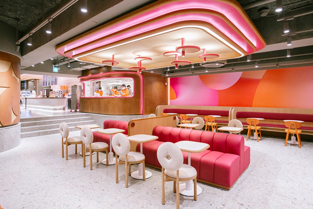던킨을 상징하는 오렌지, 마젠타 컬러에 깔끔한 우트톤의 인테리어도 눈길을 끈다. 도넛의 기본 형태인 원형을 모티브로 한 부드러운 라인이 특징으로, 매장 외부 간판은 물론, 내부에 동그란 의자와 탁자, 조명 등을 비치해 매장 전반에 우아한 곡선미를 강조했다.